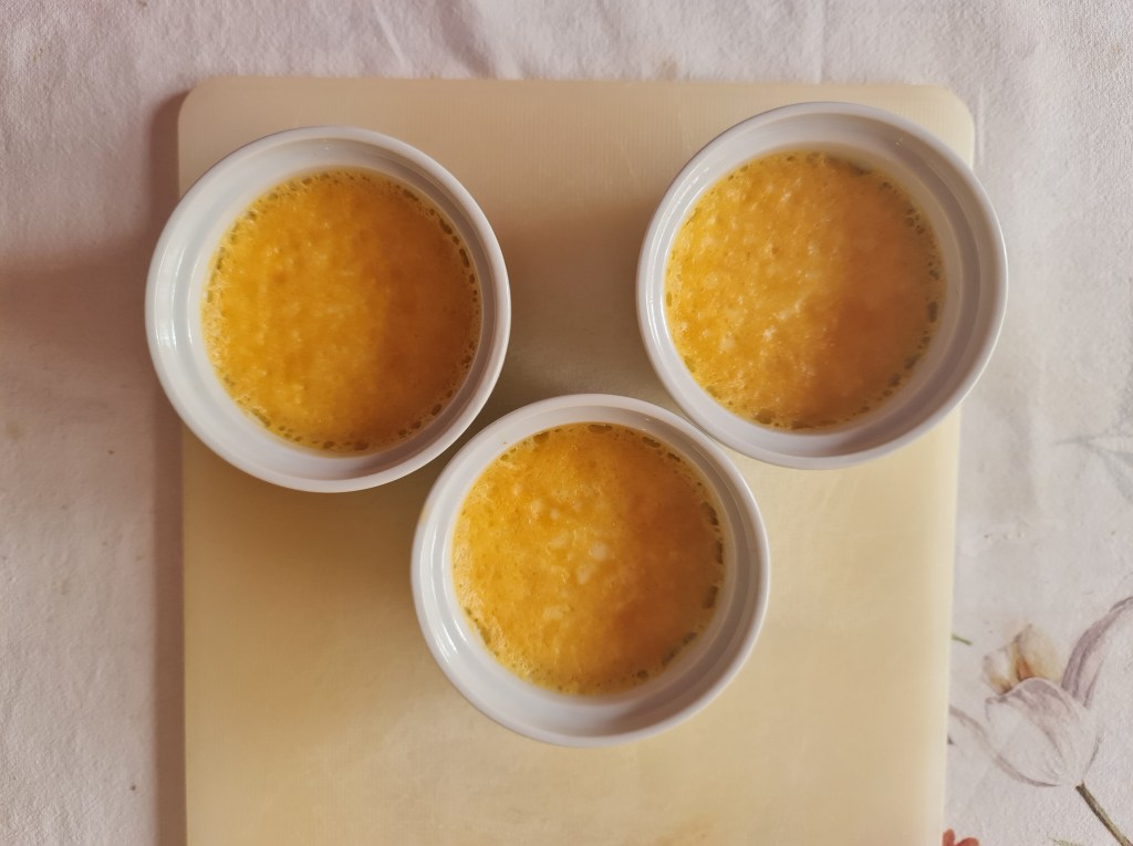 Загрейте фурната на 150 градуса и пригответе дълбока тава, в която сте наредили съдовете за крем брюле. Може под тях да поставите домакинска хартия – така няма да се пързалят при повдигане на тавата.