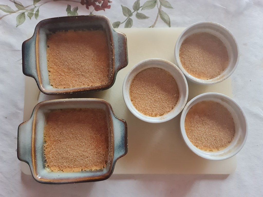 Преди да сервирате, карамелизирайте. Аз нямам горелка и затова ще ви дам инструкции как да го направите във фурна. Оставете съдовете с крема на стайна температура за 10 – 15 минути. Поръсете по възможност равномерно с кето карамел и сложете във фурната на горно ниво и включете грил функцията на средна степен.