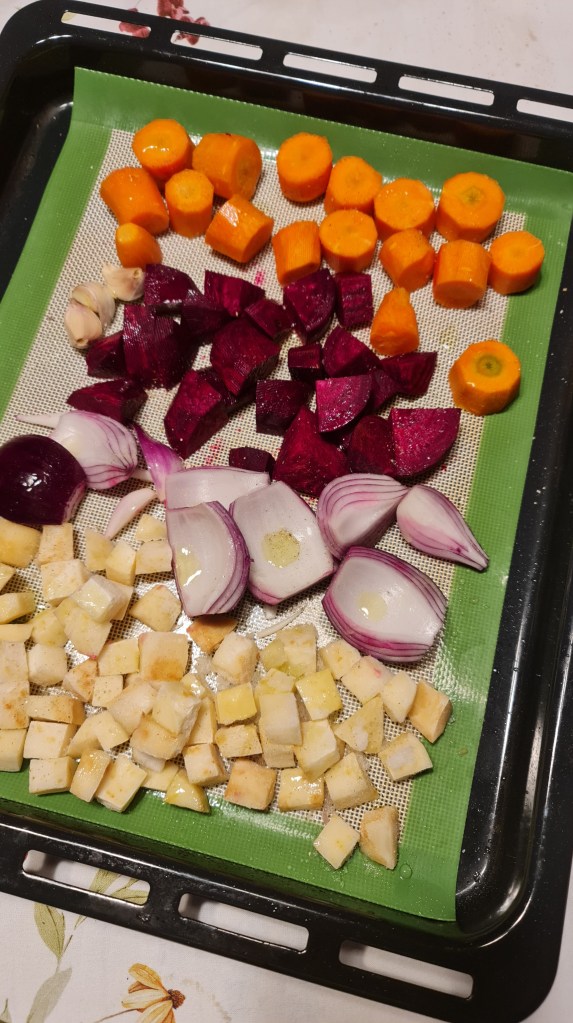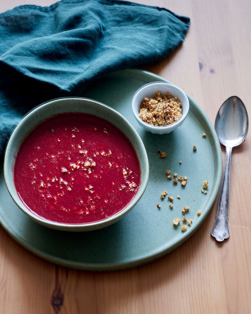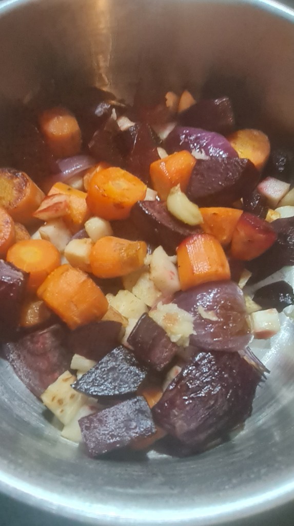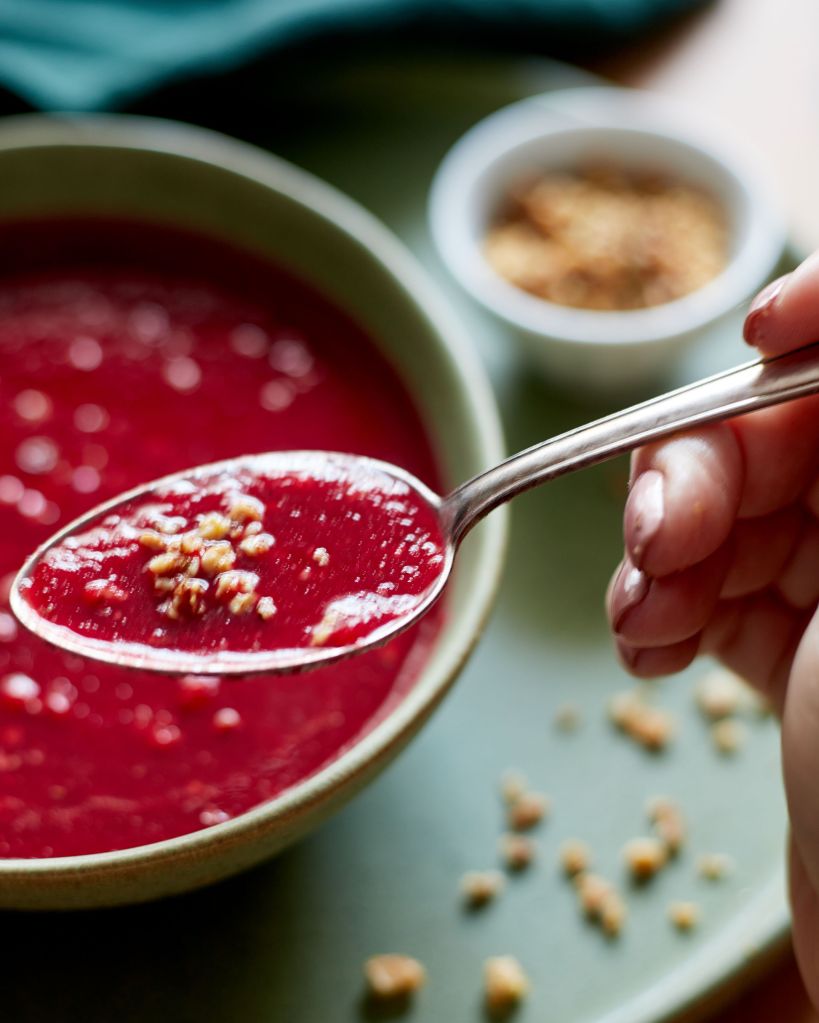 Дойде моментът за третата версия на тази много любима супа. Тя е точно за сезона и цветът й ще огрее трапезата ви дори и в най-мрачния ден. Съставът се различава от предишните две, но червеното цвекло присъства и тук. Останалите кореноплодни са червен лук, целина, моркови и чесън. За да увелича хранителната стойност, направих супата с костен говежди бульон. Ако държите да е веган, може да замените със зеленчуков или просто с вода.