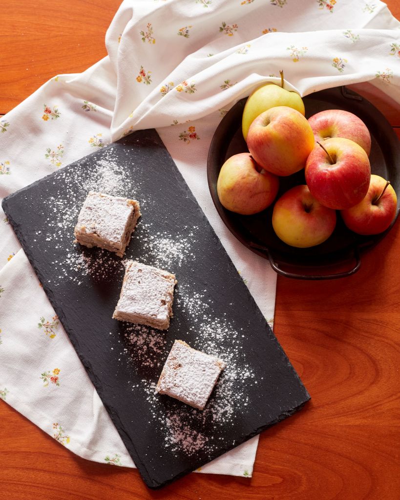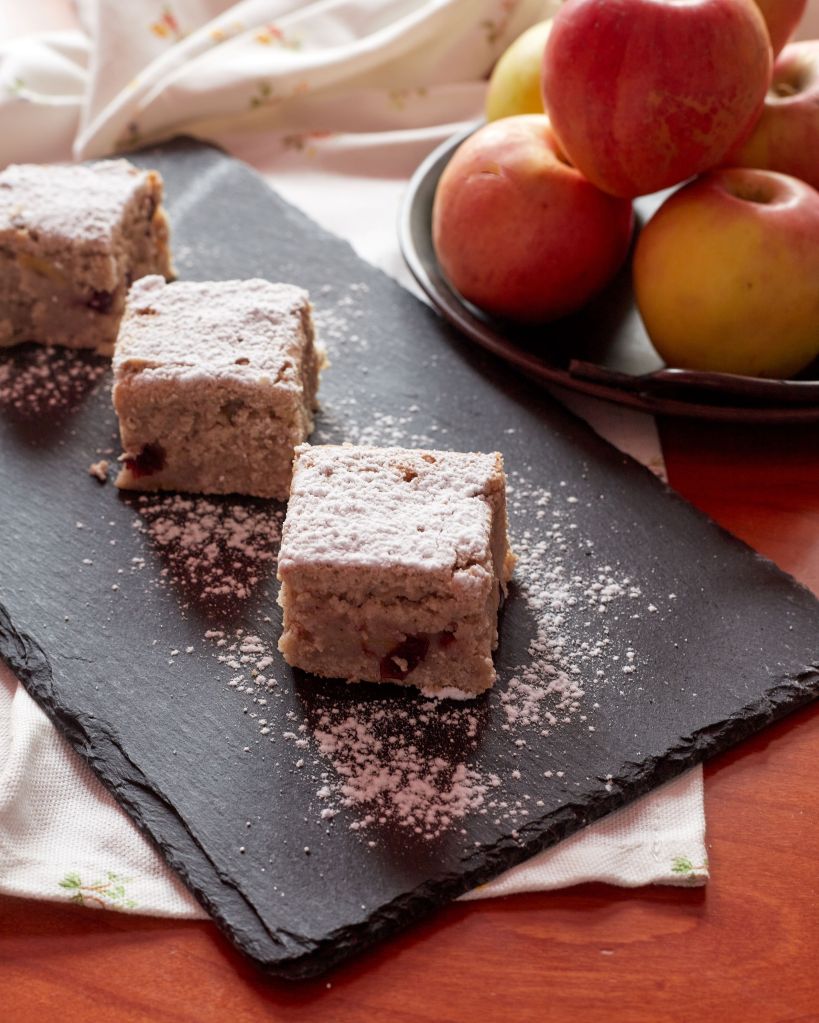 Освен ябълките добавих червени боровинки – много обичам тази комбинация – и ароматизирах с ванилия, канела и коняк. Аз търсех вариант без ядки (единственият компромис беше бадемовото мляко), но вие можете да добавите и леко запечени орехи, които ще се впишат чудесно.