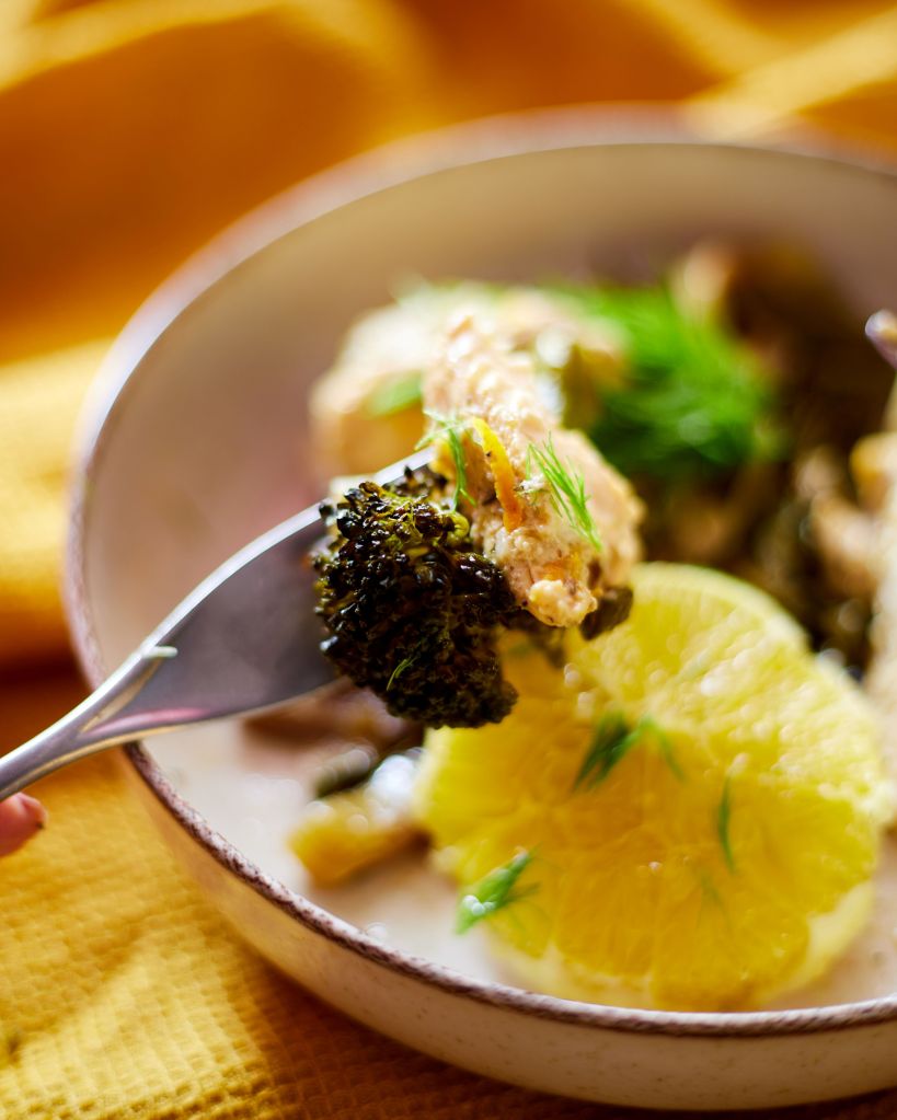 Идеята за тази рецепта тръгна от една връзка праз и две глави фенел и еволюира до едно от най-вкусните ястия с пиле, които съм готвила. Когато нещата придобиха конкретност и набавих всички продукти, прибегнах към тежката артилерия – в пряк и преносен смисъл. Извадих чугунената тенджера 😀. Ястието се готви само в един съд, който трябва да е подходящ за котлон и фурна. Ако нямате такъв, прехвърлете в друг подходящ съд, преди да сложите във фурната.