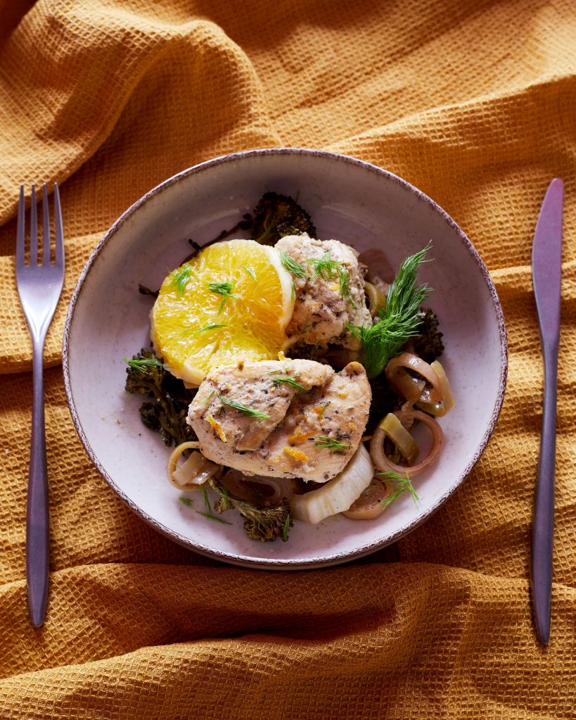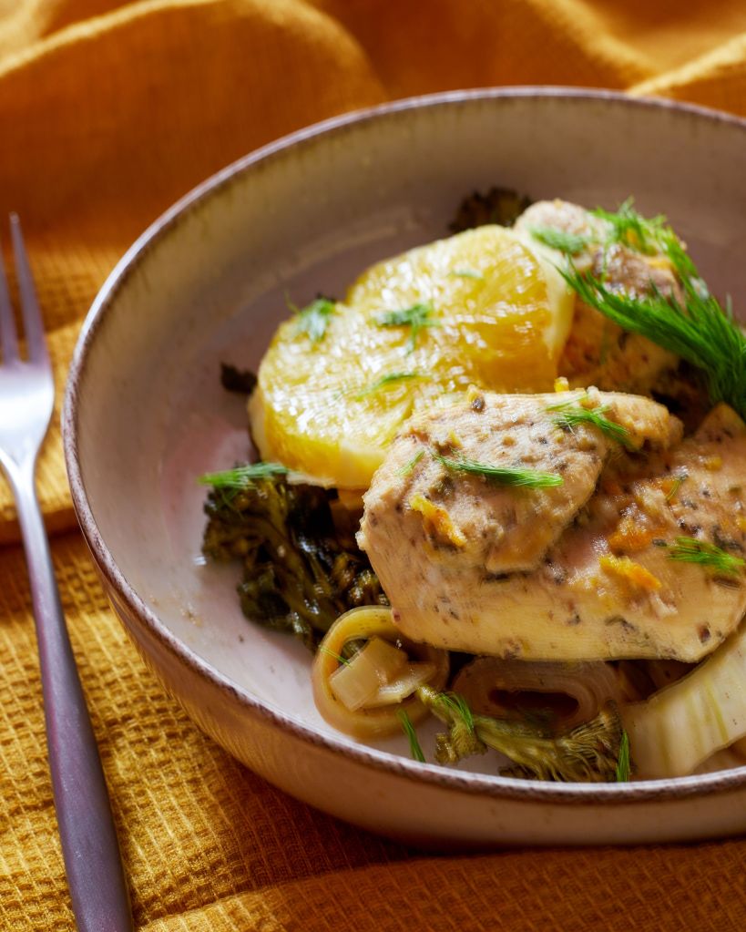 Сложете съда, покрит с капака, във фурната и печете 30 – 35 минути. Махнете капака и наредете отгоре резените портокал. Печете още 10 минути. Сервирайте топло и гарнирайте с пера от фенел или пресен копър.