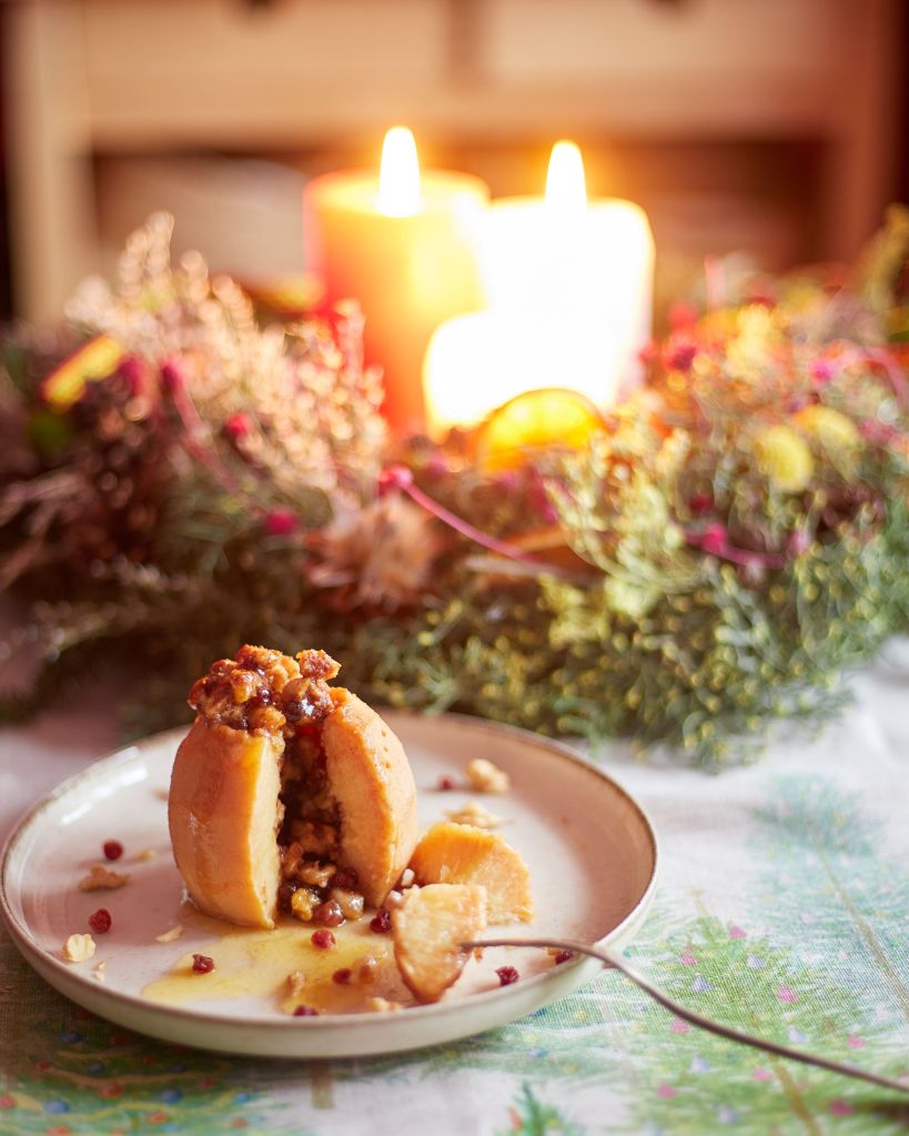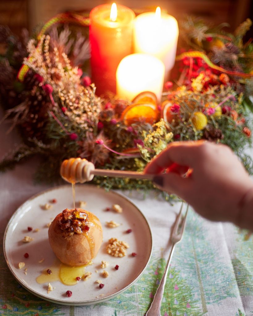 С пълнежа надали ще ви изненадам – орехи и червени боровинки, подкрепени от масло, коняк, канела и прясно настъргано индийско орехче. За веган версия може да замените маслото с кокосово. Завърших тази прекрасна коледна картина с мед от Истински мед, при които можете да се абонирате и да подкрепите българските пчелари.