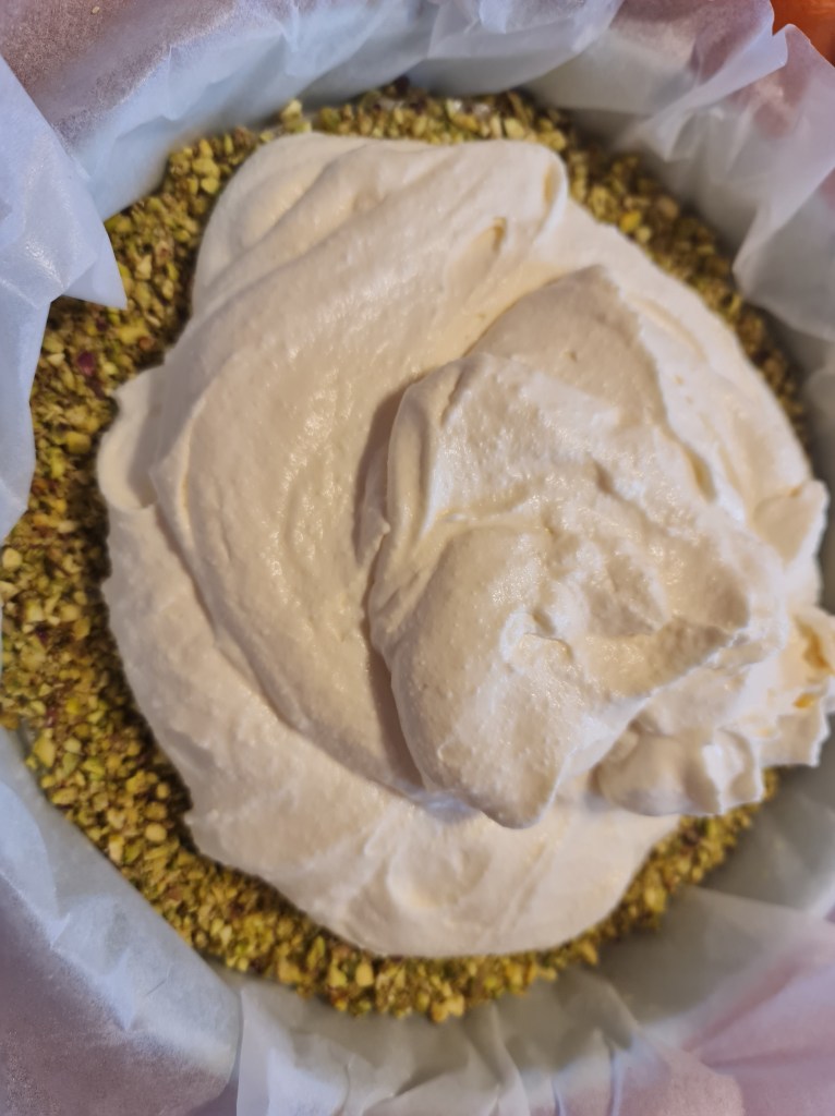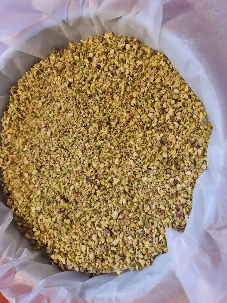 Върху гладка повърхност сложете една оризова кора, намажете с масло и поръсете с еритритол. Отгоре сложете останалия шам фъстък като запазите 3 – 4 с.л. Разпределете на равномерен слой и върху него сложете оризова кора. Намажете с масло и поръсете с еритритол. Внимателно пренесете върху чийзкейка.