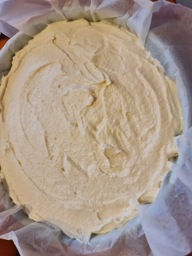 В купа разбийте продуктите за чийзкейка. Последователността не е от значение, но аз започнах от яйцата. Крайната смес ще бъде гъста. Излейте върху шам фъстъка и заравнете с лъжица.
