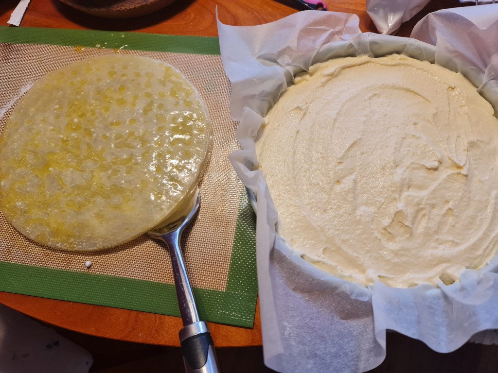 1. Оризовите кори са по-дебели и доста по-жилави от пшеничните. По две кори за основа и горна повърхност са напълно достатъчни. Това е причината да не може (поне според мен) да се направи баклава с тези кори. Ако идеята за чийзкейк не ви допада, но искате нещо подобно на баклава, може да пробвате Гюллач. За него корите се накисват в мляко, без печене и омекват.