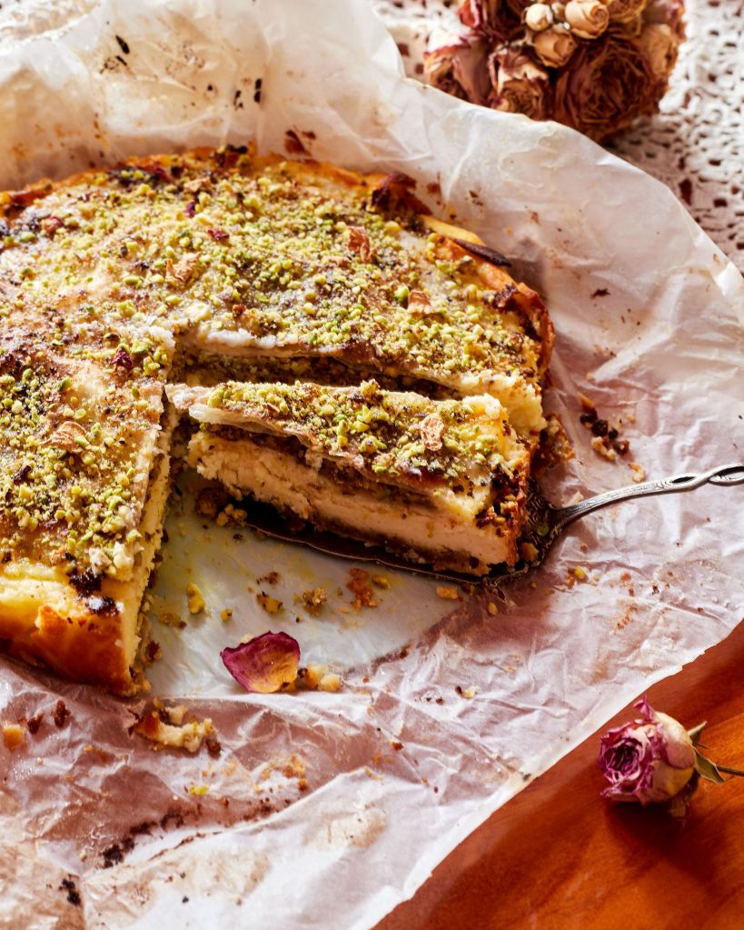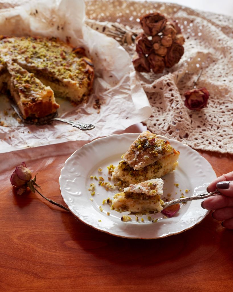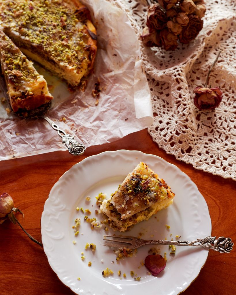 Пригответе сиропа, като загреете водата с ксилитола и лимона. Когато заври, намалете до къкрене и варете 8 – 10 минути. Свалете от котлона и, след като се охлади то температура малко над телесната, добавете розовото масло. Извадете чийзкейка от хладилника и сиропирайте. Поръсете с останалия шам фъстък. По желание може да добавите и сушени листенца от роза. Нарежете с много остър нож.