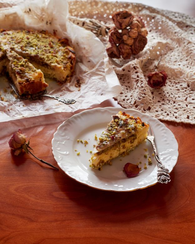 Пригответе сиропа, като загреете водата с ксилитола и лимона. Когато заври, намалете до къкрене и варете 8 – 10 минути. Свалете от котлона и, след като се охлади то температура малко над телесната, добавете розовото масло. Извадете чийзкейка от хладилника и сиропирайте. Поръсете с останалия шам фъстък. По желание може да добавите и сушени листенца от роза. Нарежете с много остър нож.