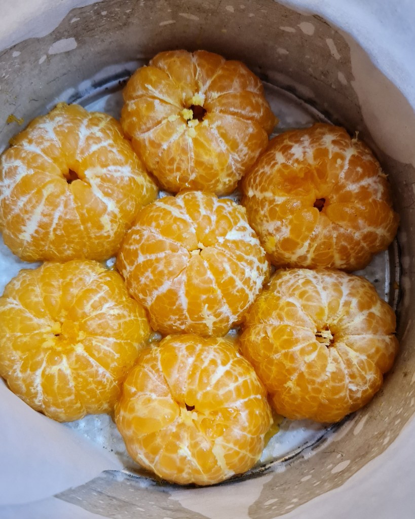 Загрейте фурната на 180 градуса и пригответе тавичка с диаметър 18 см, покрита с хартия за печене. Наредете мандарините на дъното с разреза надолу.