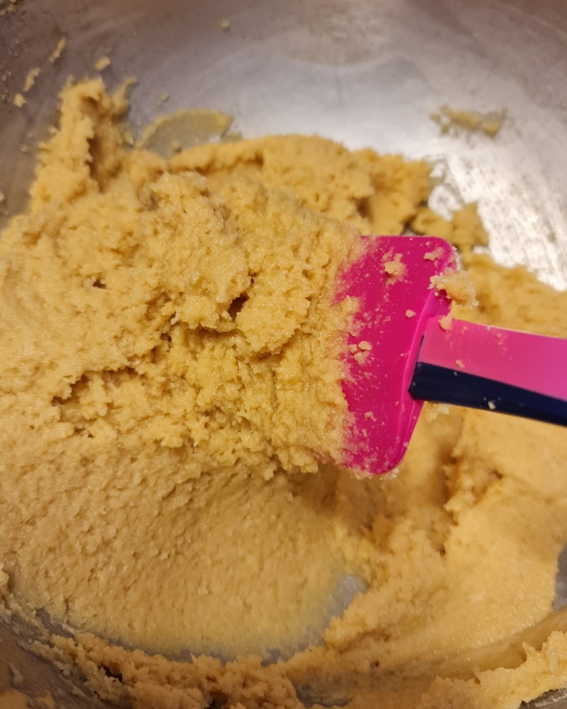 Разбийте маслото с кето карамела, много добре. Добавете яйцата едно по едно, като разбивате добре след всяко. В купа смесете добре пресятото брашно с бакпулвера, хуска и солта. Добавете на части към маслената смес. Ще получите относително гъсто маслено тесто. Последно добавете маслата от канела и карамфил. Разбъркайте.