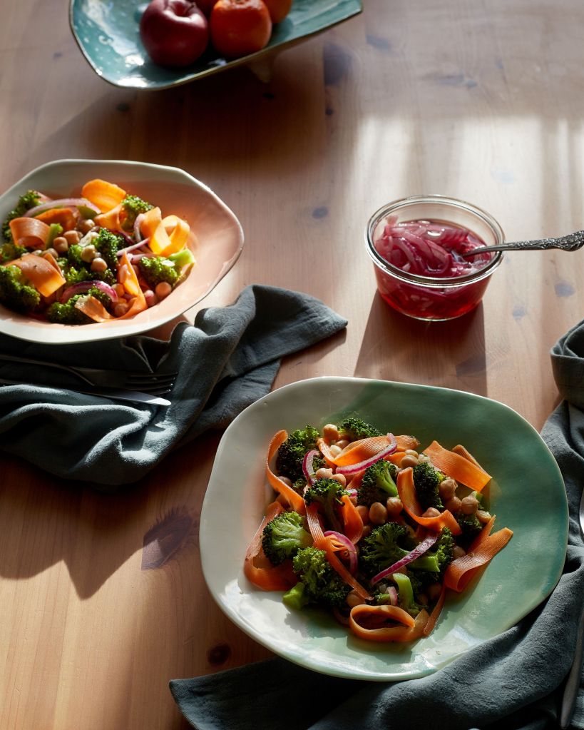 Докато лука се маринова загрейте вода в съд за готвене на пара. Добавете цветчетата и гответе 5 до 8 минути, според това колко хрупкави ги предпочитате. Нарежете морковите на тънки ленти. Най-лесно е с картофобелачка.