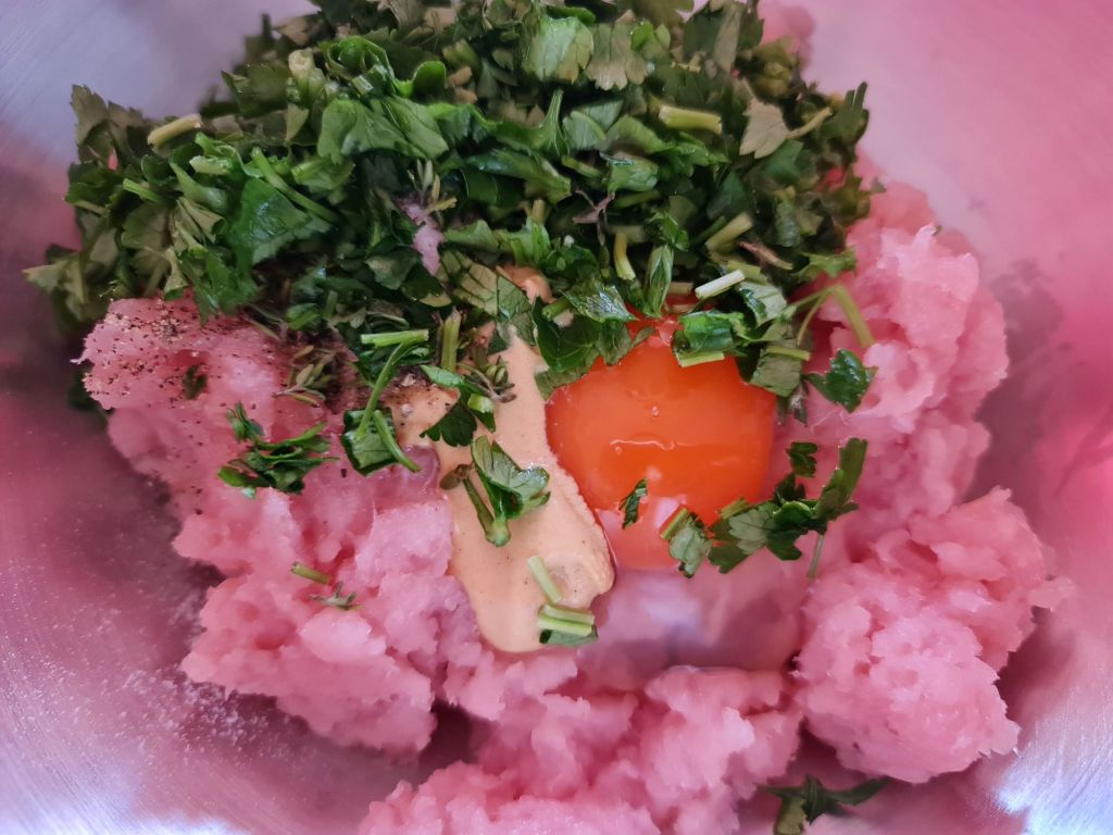 Междувременно в голяма купа смесете пуешкото, яйцето, горчицата и подправките.
