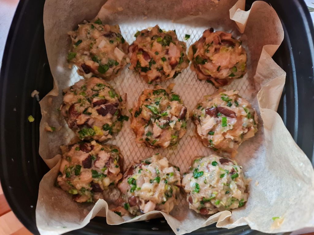 Покрийте кошницата на Air Fryer с хартия за печене и намажете леко със зехтин. Оформете 9 кюфтета и ги разположете в кошницата.
