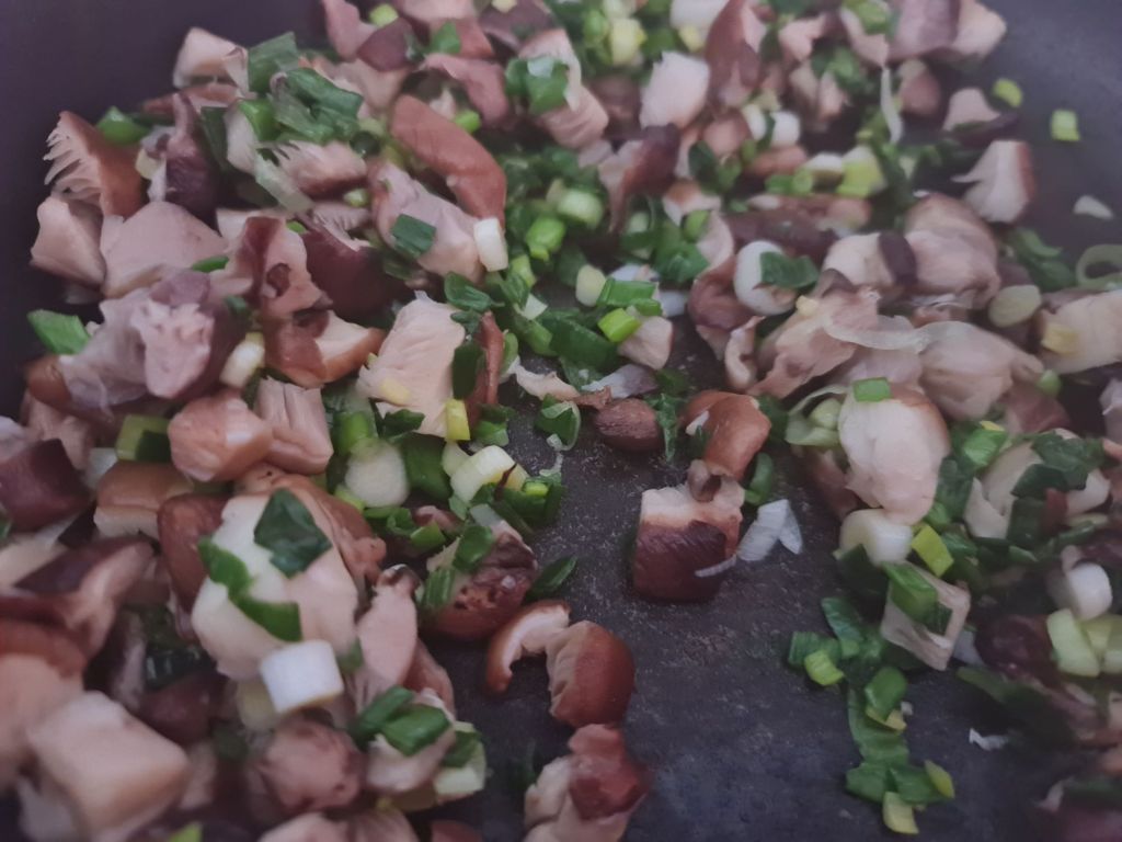 Загрейте зехтина на средна степен на котлона. Добавете пресния лук и задушете за около минута. Добавете гъбите и гответе още 4 – 5 минути.