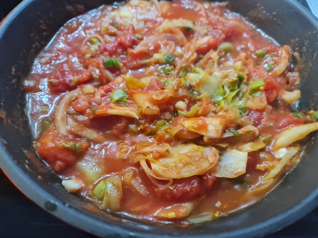 Добавете доматите (ако са цели, намачкайте леко предварително) и сока им, плюс 50 до 100 мл вода (започнете с 50 и добавете още, ако се изпари прекалено бързо. Изчакайте сместа да заври, след което намалете до къкрене и гответе 10 – 12 минути, без капак.