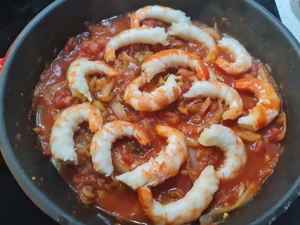 Увеличете леко степента на котлона и добавете почистените скариди. След минута две добавете сварената папуда, разбъркайте и гответе около 2 – 3 минути.