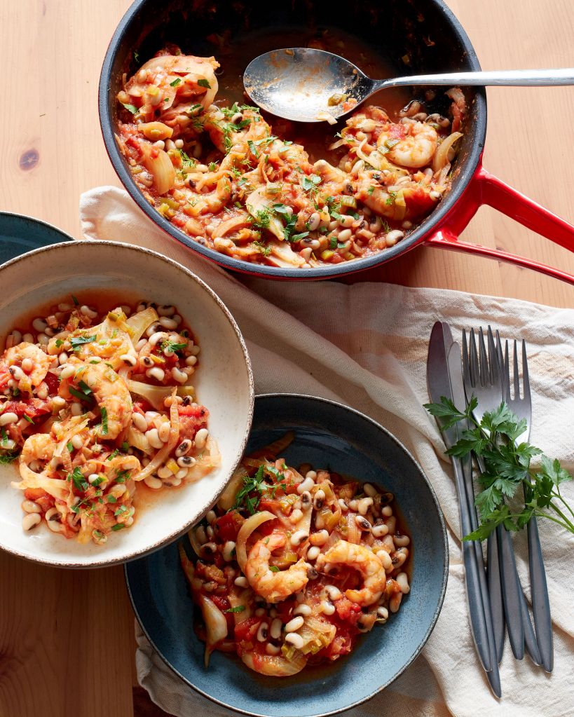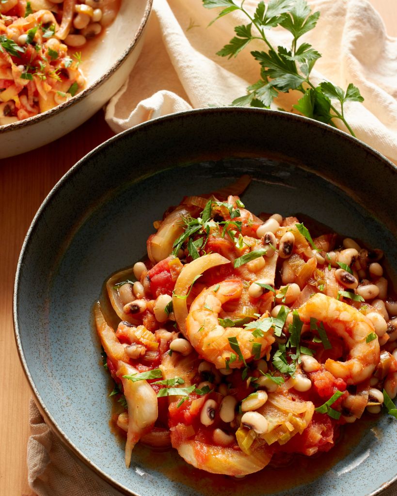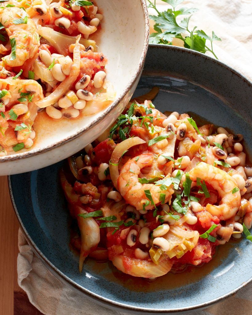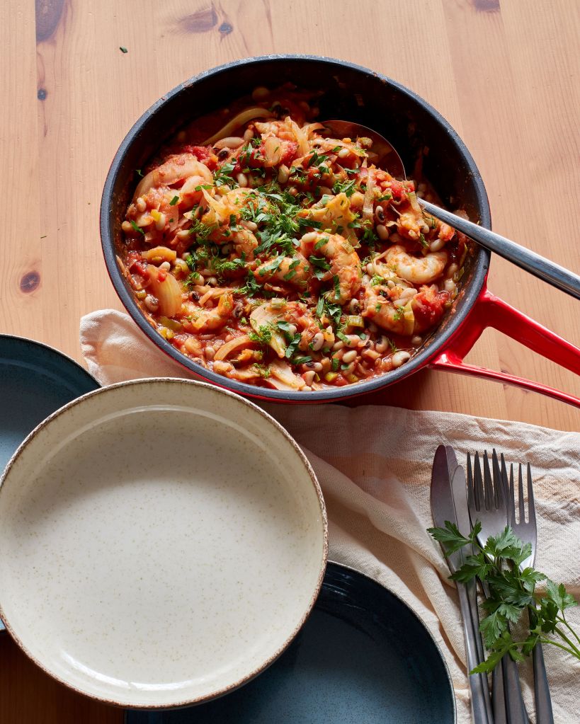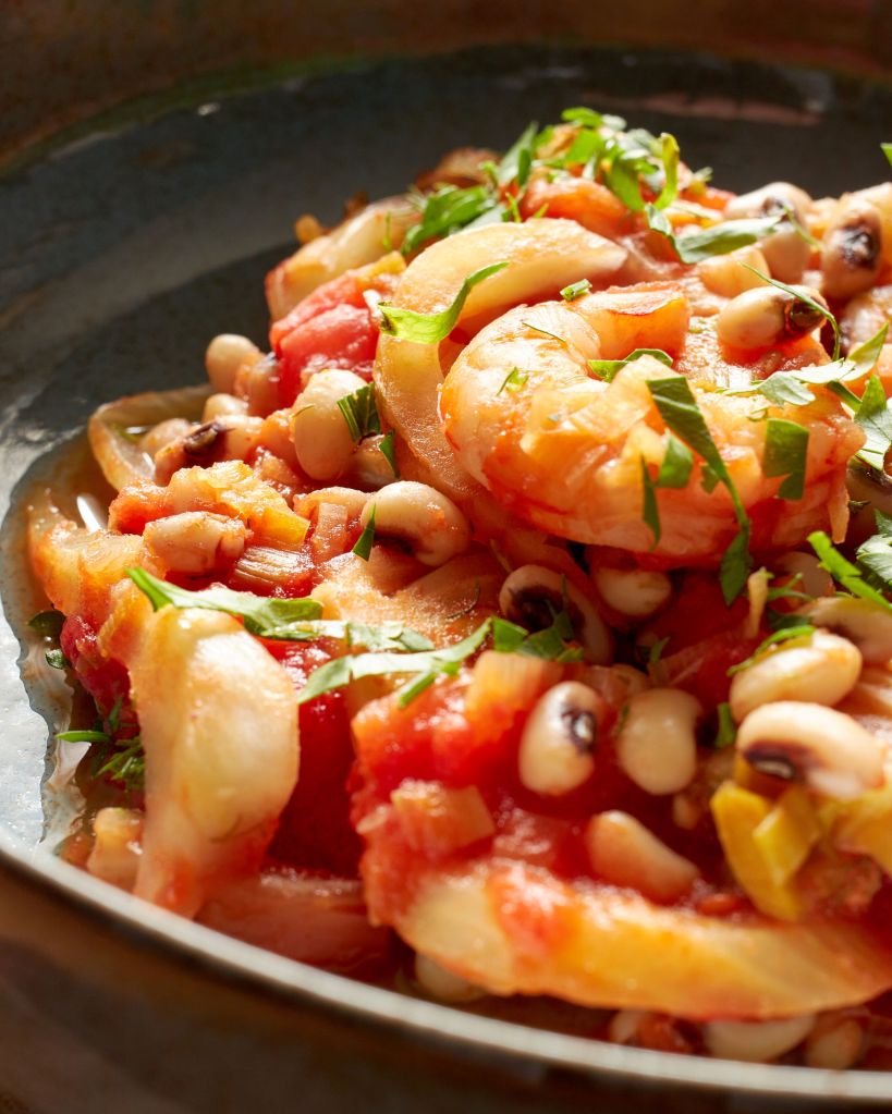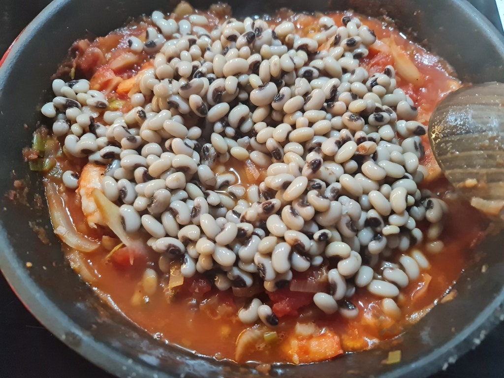 Странно е скариди с боб, но се оказа добра комбинация. Видях нещо подобно в кулинарната секция на NYT, докато търсех идеи за едни скариди. Там беше с бял боб, обаче аз, като един виден нелюбител на това вариво, естествено нямах такъв. Но пък имах малко останала папуда и тя свърши чудесна работа.