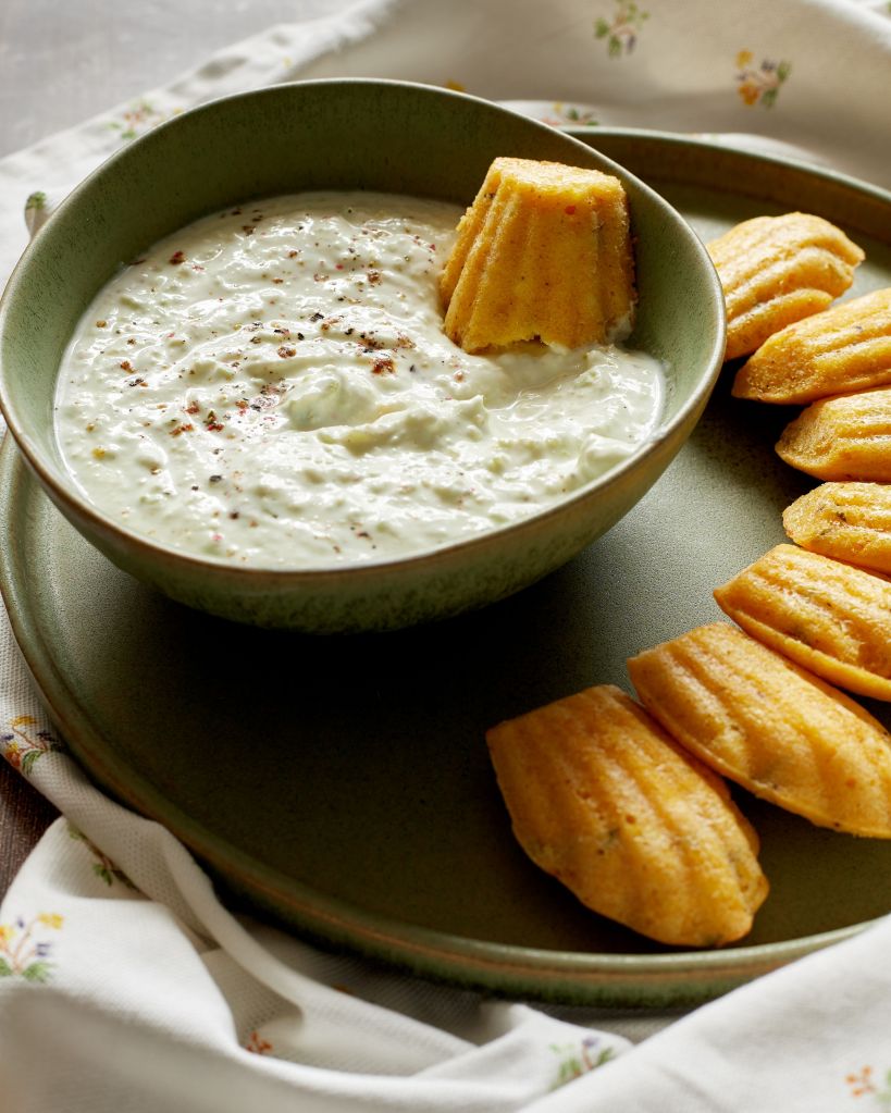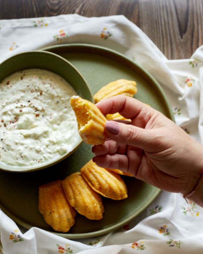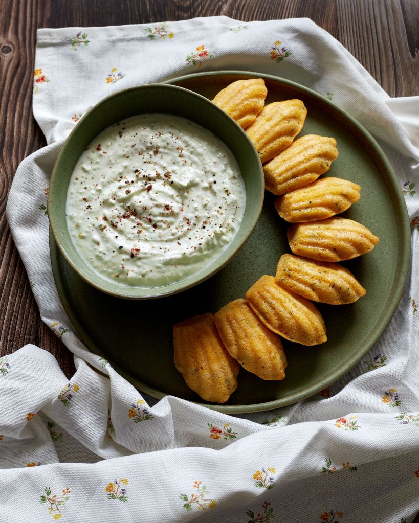 Добавих дип на основата на авокадо и кисело мляко и се получи едно прекрасно предястие, което е най-добре да се яде докато мадлените са още топлички.