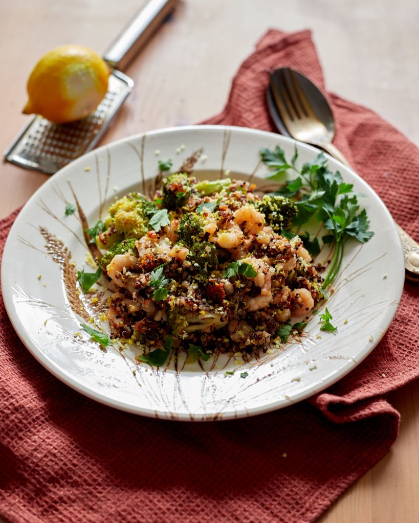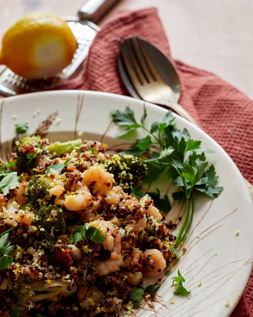 При мен се получи като оползотворяване на остатъци, но можете да си направите това ястие и без такъв повод и няма да съжалявате. Аз имах броколи на пара, останали от един обяд и киноа с маслини и сушени домати, останала от друг обяд. Имах също и един пакет с дребни диви скариди от Северно море, който се доближаваше опасно до края на срока си на годност и това реши съдбата им.