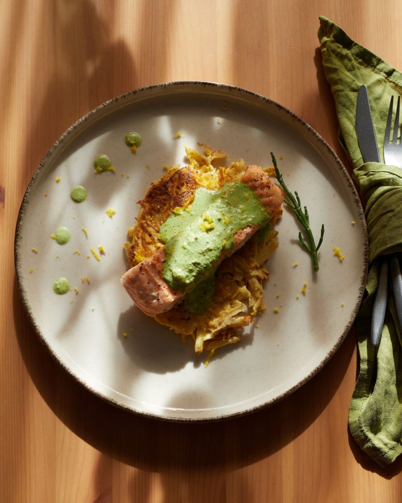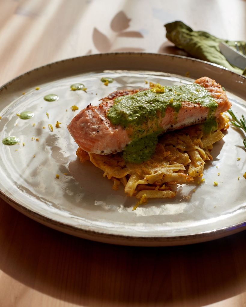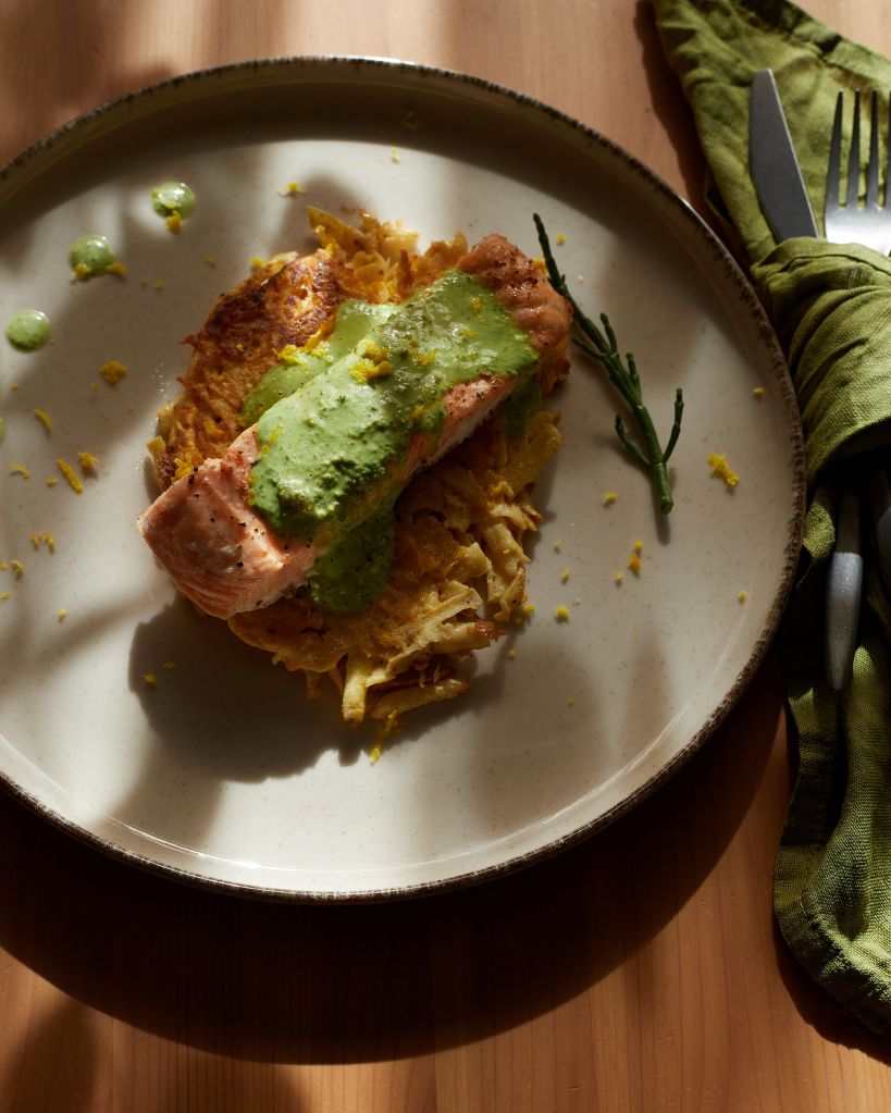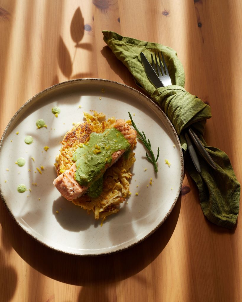 Докато приготвяте соса, сгответе сьомгата. Подправете със сол и черен пипер и гответе 10 – 12 минути на 160 градуса в air fryer. Ако предпочитате на фурна, използвайте обичайните си настройки.