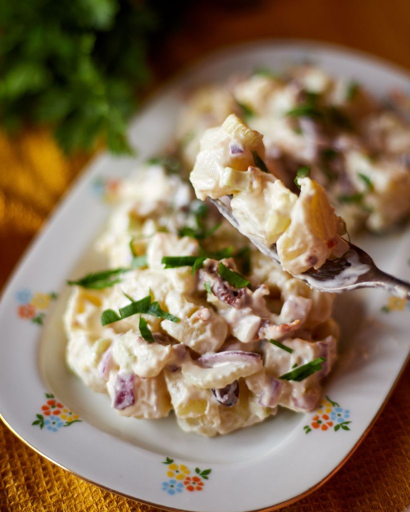 В днешната рецепта няма нищо сложно или уникално. С нея искам да припомня на тези от вас, които следят гликемичния индекс на храната си и/или следват нисковъглехидратна диета, че не е необходимо да изхвърляте картофите от менюто си. Стига само да ги консумирате сварени и охладени (напълно, за около 24 часа в хладилник). Така нишестето, което иначе ги прави неприемливи и предизвиква пикове на глюкозата, се превръща в устойчиво и не се усвоява в стомаха и тънките черва, като при това подобрява храносмилането, подхранвайки чревната флора и спомага за понижаване на кръвната захар.