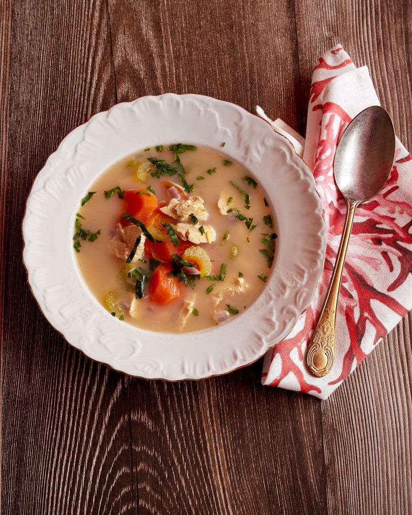 Пилешката супа може да вдигне болен и да подобри настроението на почти всеки. Сигурна съм, че имате любима, може би семейна, рецепта, но все пак искам да ви предложа този нетрадиционен прочит. Пилето в това ястие може да бъде останало от друго готвене, печено или варено. Аз направих супата с гърди, защото ги предпочитам, но всяка част на пилето става.