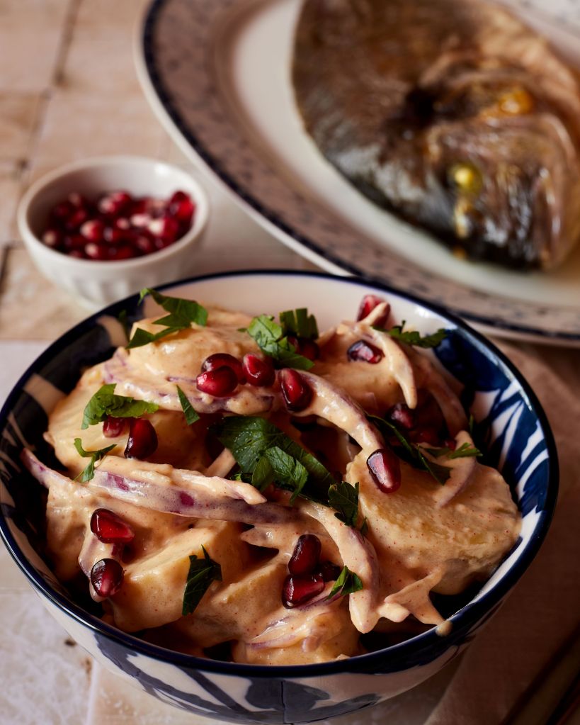 В тази рецепта са съчетани с червен лук, нар, пресни зелени подправки и дресинг от кисело мляко и горчица с кимион и червен пипер. Сервира се студена, което освен диетична я прави и изключително удобна, понеже може да приготвите всичко предварително и само да залеете със соса преди сервиране.