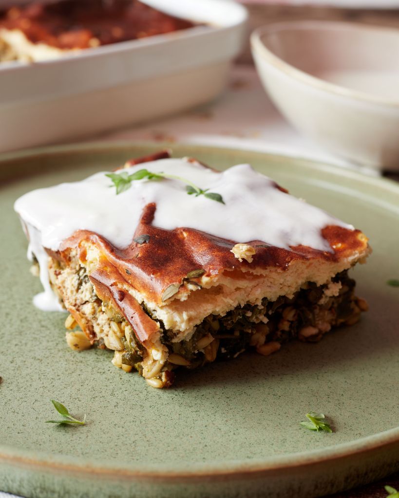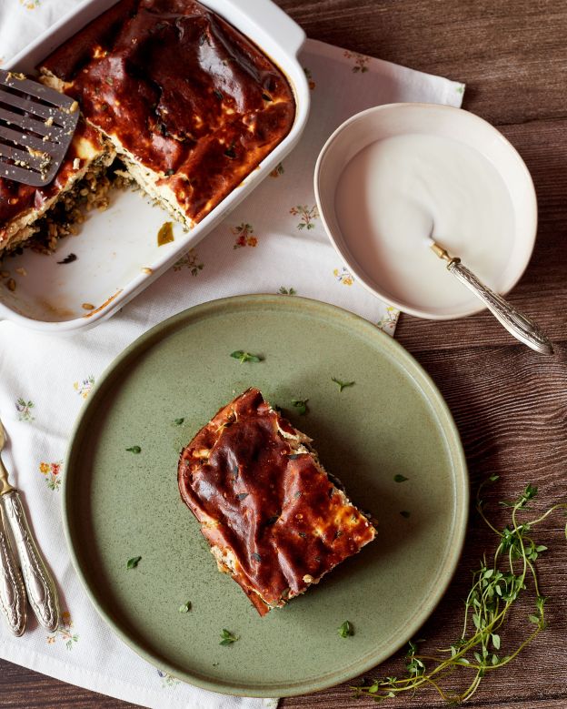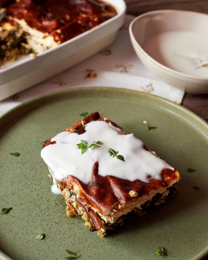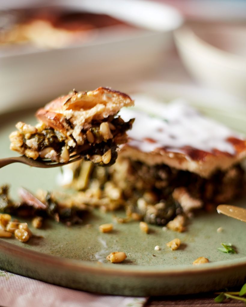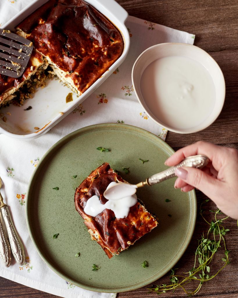 Имах лапад, киселец, коприва и левурда, но манголд, спанак, листа от цвекло ще свършат същата работа. В заливката сложих яйца, козе кисело мляко, извара от козе мляко и пармезан.