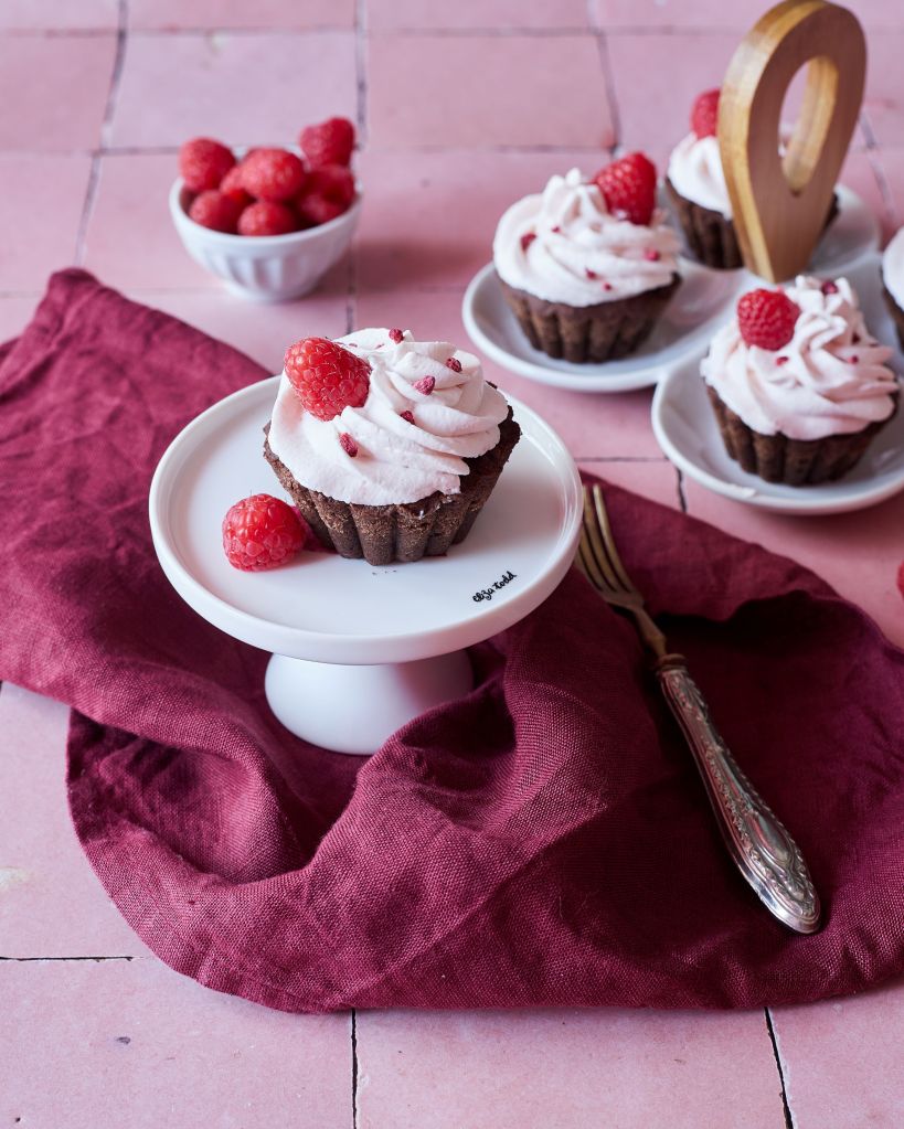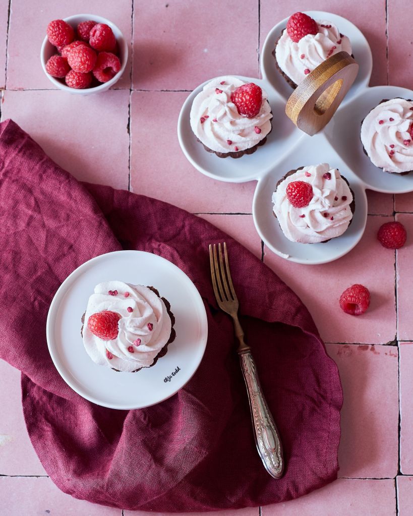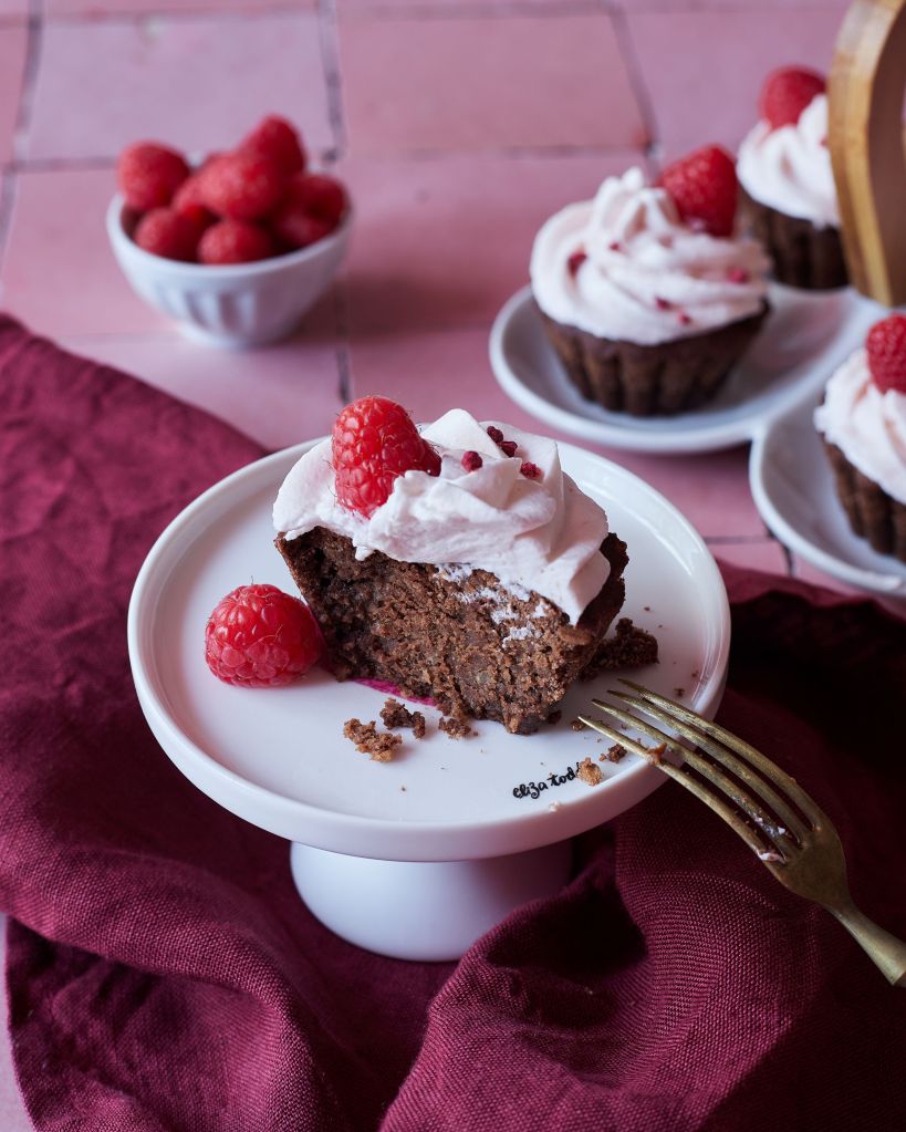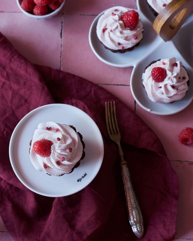 Като контрапункт добавих глазура от ефирна бита сметана и гарнирах с пресни малини и малинов кръмбъл. Станаха чудесни – хем много шоколадови, хем леки.