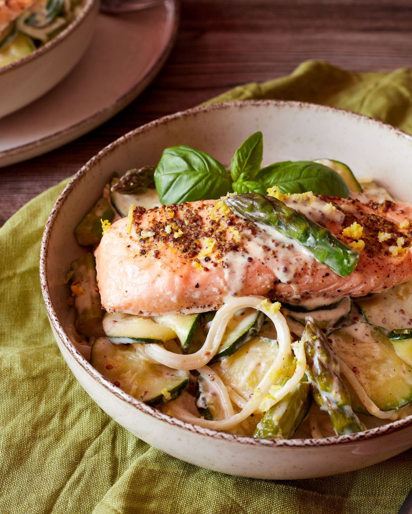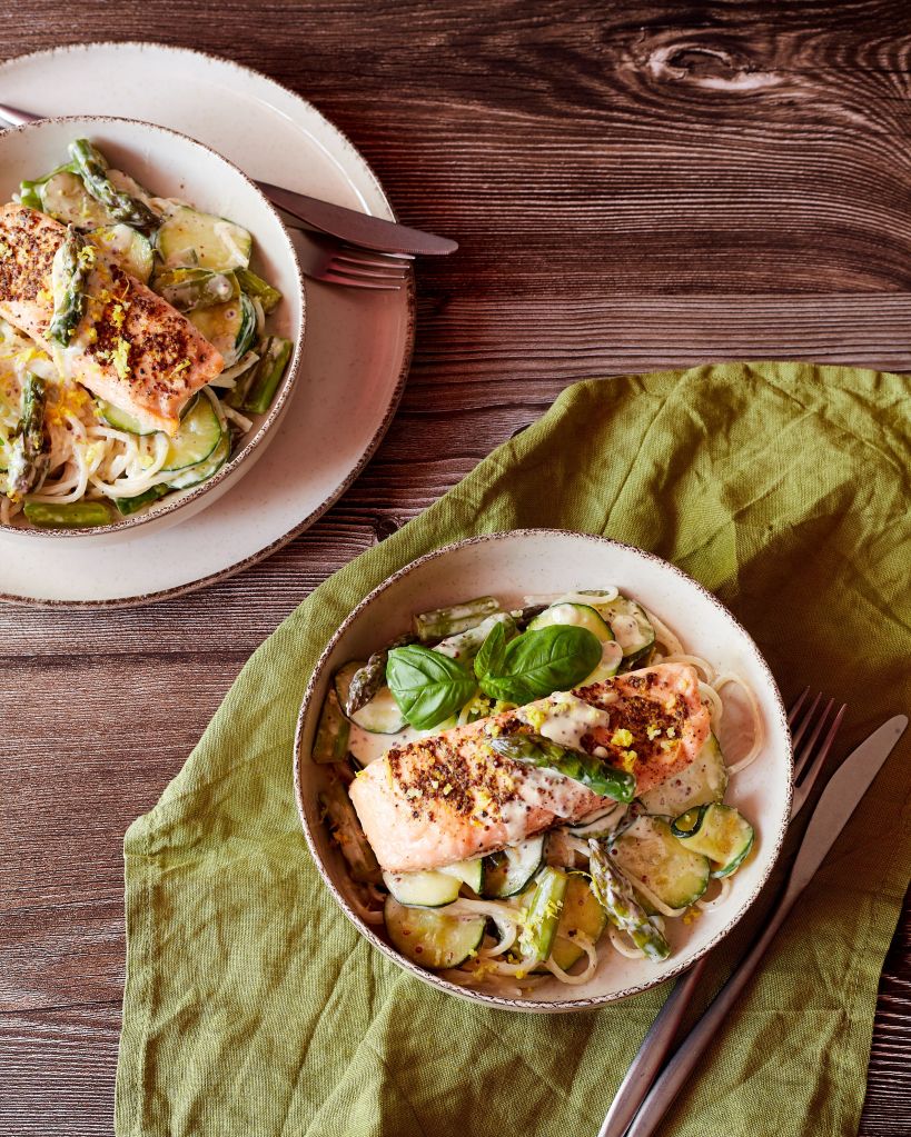 Освен сезонно, свежо и вкусно, това ястие се приготвя много бързо. Докато сьомгата се пече и пастата се вари, зеленчуците се задушават в зехтин. За по-малко от половин час имате готов обяд или вечеря, които ще оставят всички доволни и сити.