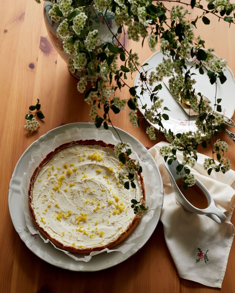 Докато основата се пече, пригответе пълнежа. В блендер сложете всичко без лимоновия сок и водата и обработете докато се смесят добре. Добавете лимоновия сок и водата и блендерайте до кремообразна смес. Добавете лимоновата кора и разбъркайте. Прехвърлете върху основата и сложете в хладилника за поне 4 часа, най-добре цяла нощ.
