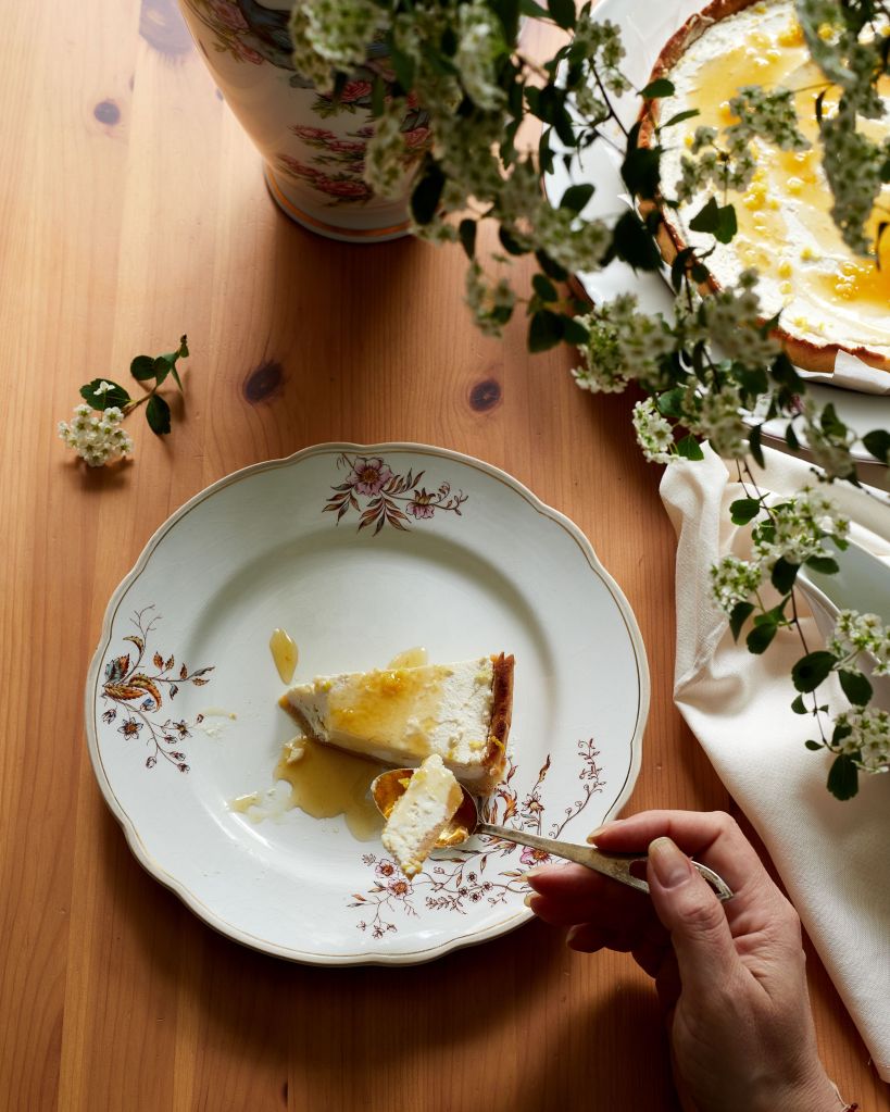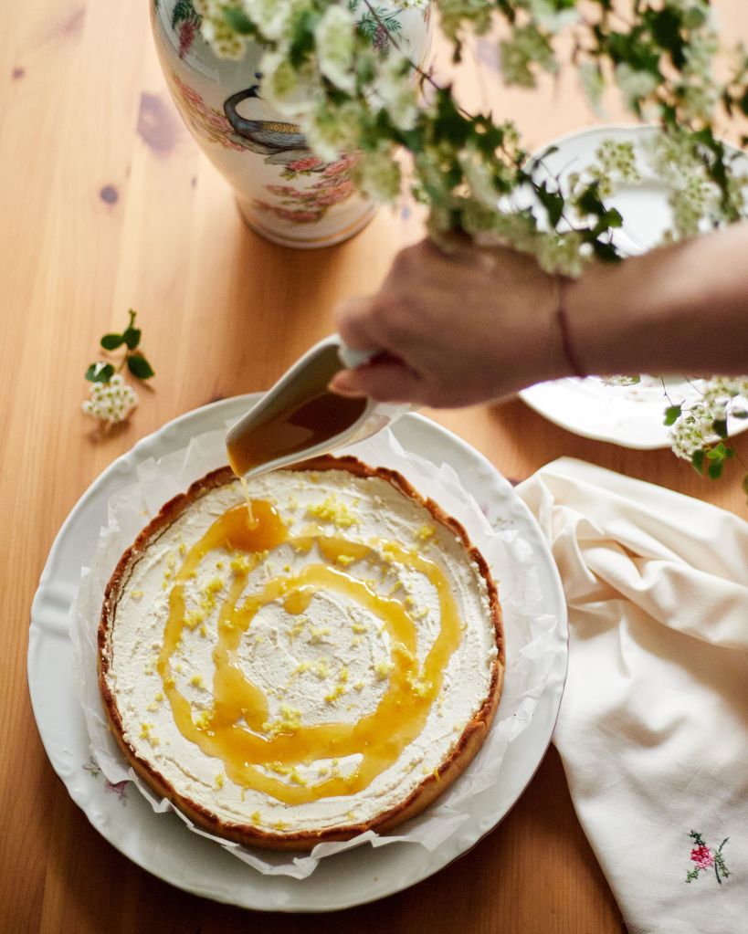 Основата се пече (макар да не съдържа нищо, което задължително иска топлинна обработка, мисля, че така е по-вкусна), а пълнежът е суров. Да, предполагам вече разбрахте – няма яйца, което прави рецептата подходяща за хора, които по здравословни причини ги избягват.
