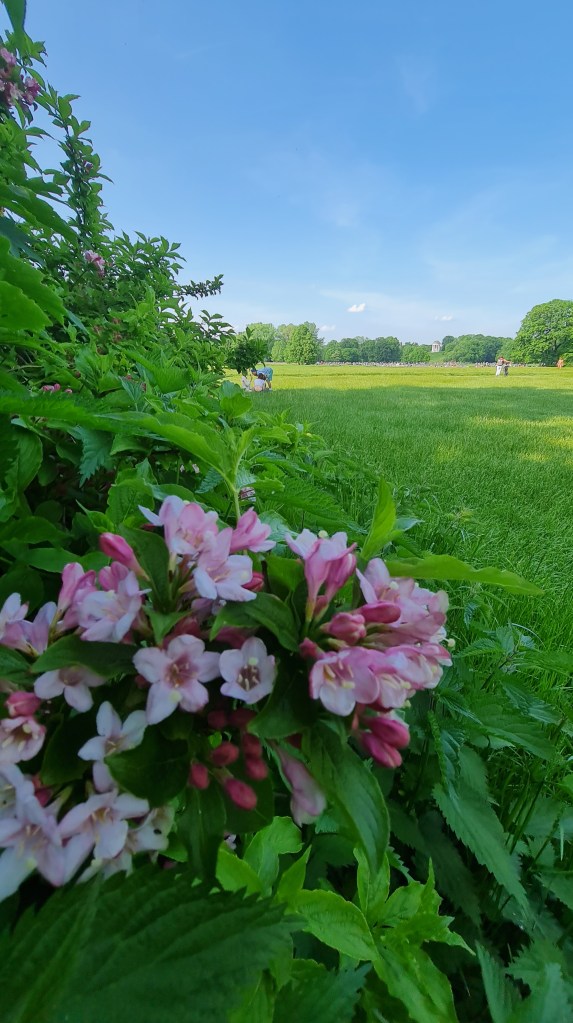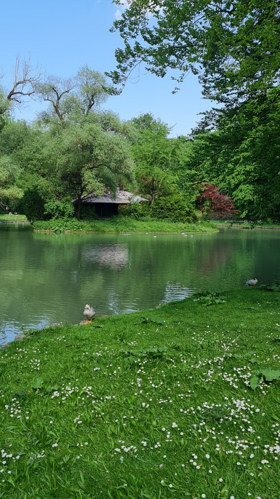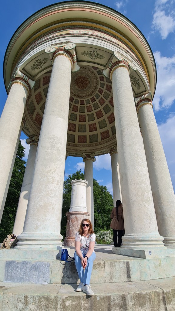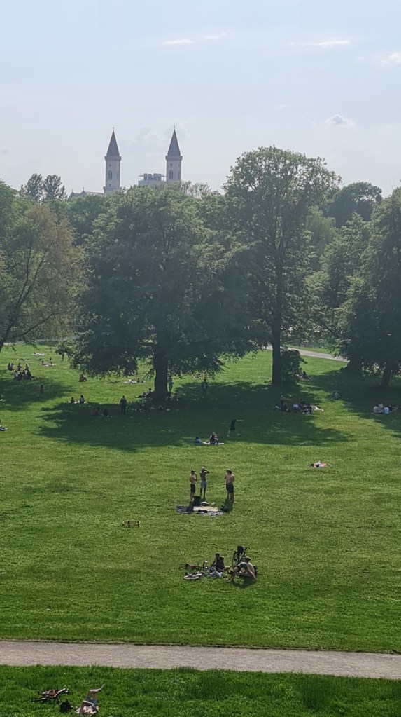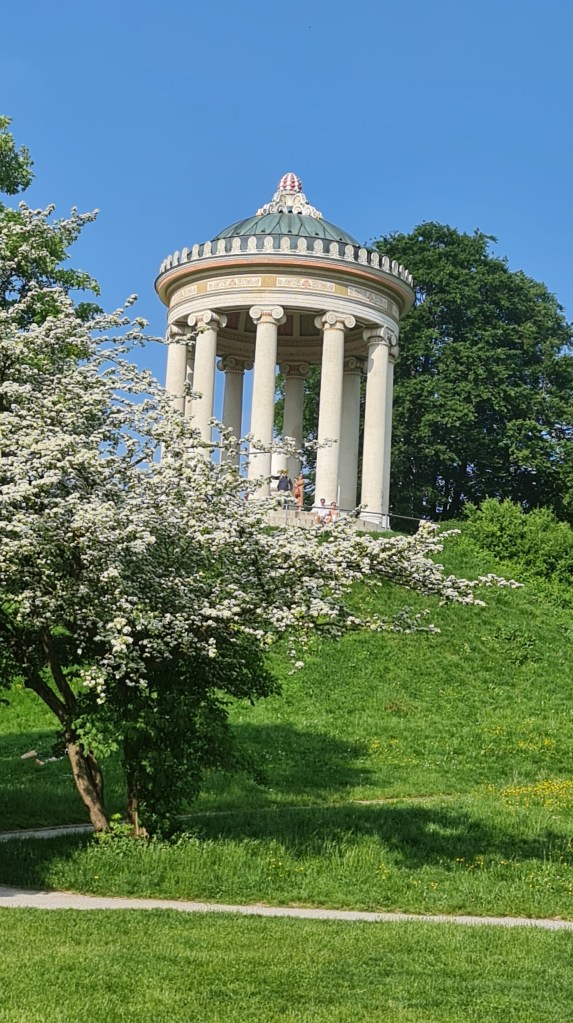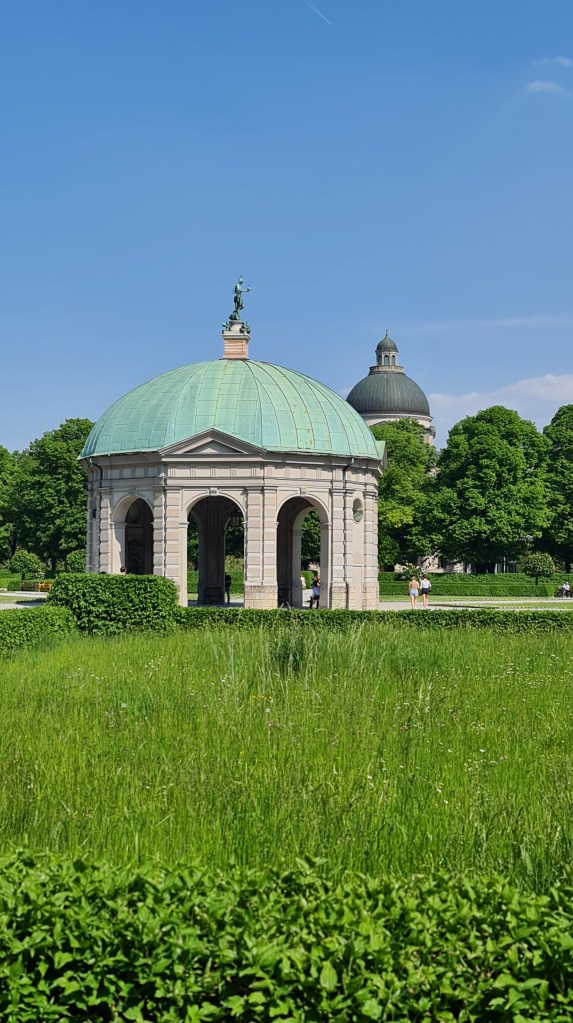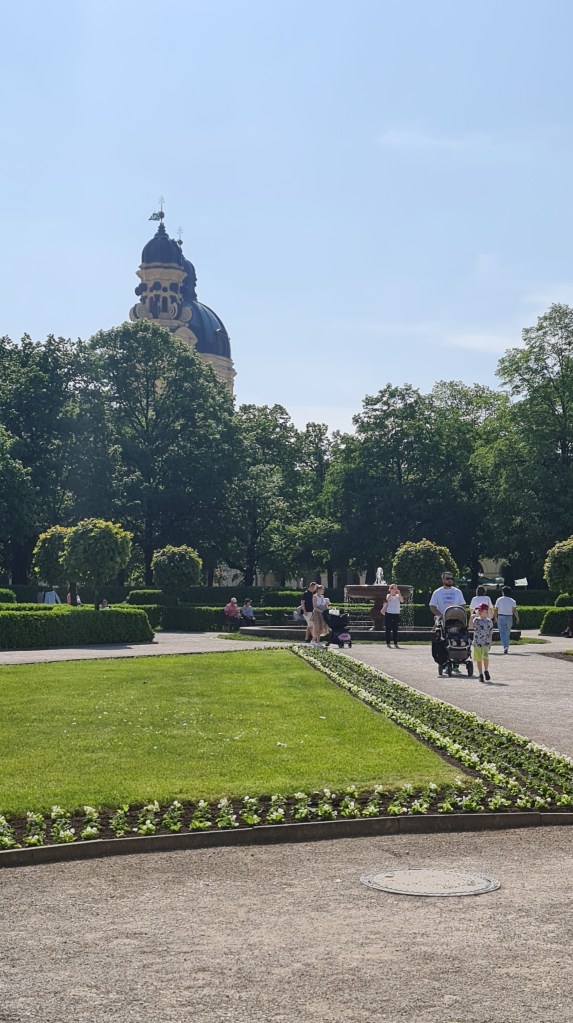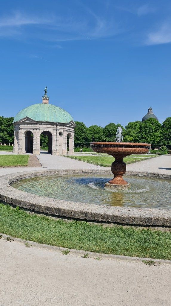 До резиденцията има градина с фонтани, пейки и централна беседка. От нея можете да преминете в Английската градина, която е много голяма и е идеално място за разходки, пикник и дори плаж, какъвто беше случая на 22 май т.г. Бяхме малко ограничени във времето и не успяхме да стигнем до голямото езеро, но погледнахме към града от Моноптера (реплика а гръцки храм, построена от Лудвиг I).