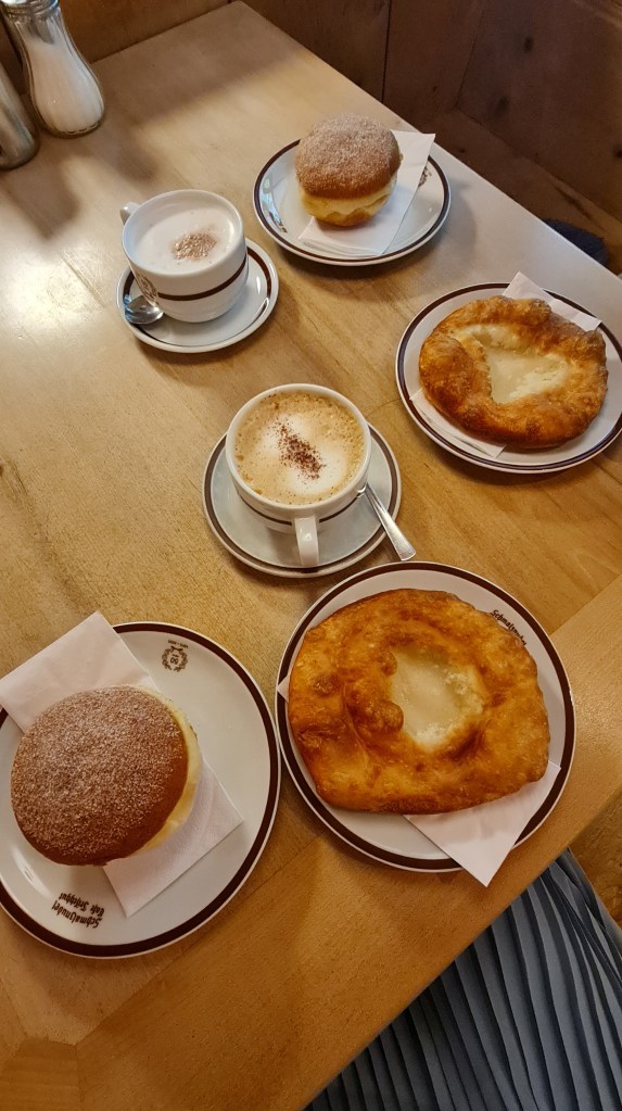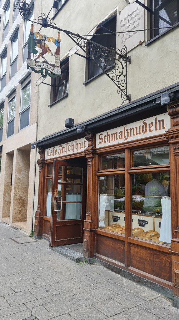 Другото място за закуска, което посетихме, е Kafe Frischhut. Намира се до централния пазар Viktualienmarkt. Асортиментът е по-скоро беден, но имат пресни мекици, понички с мармалад от кайсии и още един вид печиво, което не опитахме. Ако ви се хапва нещо, което има вкус на домашен уют в събота сутрин – това е мястото.