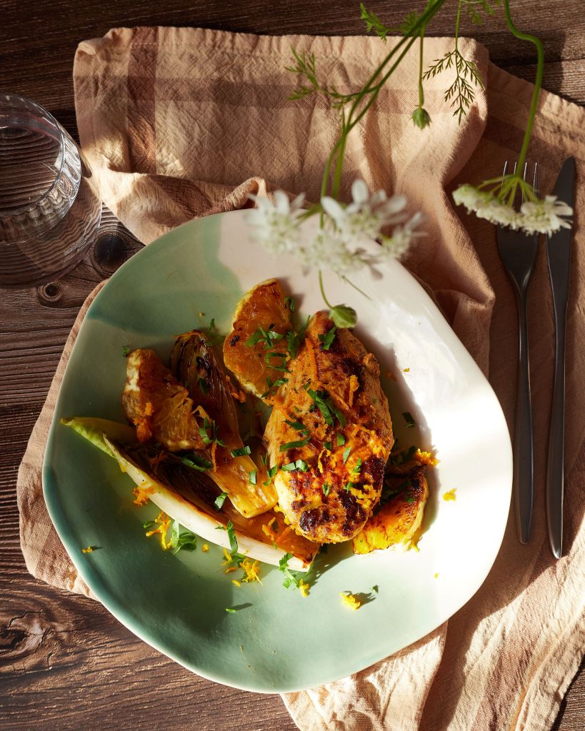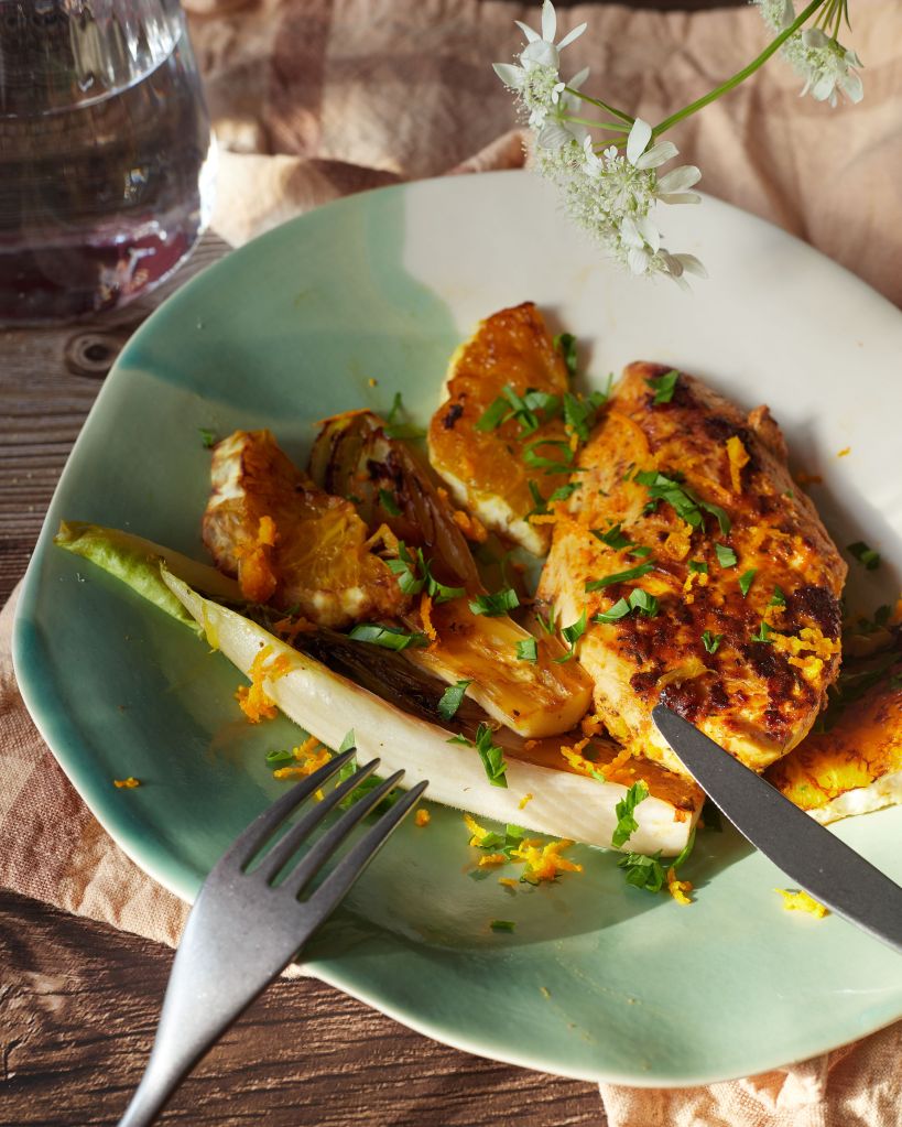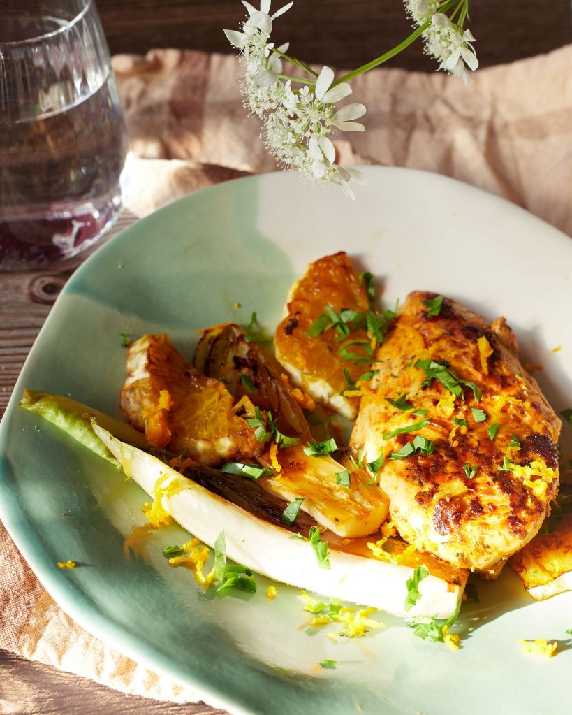 Сервирайте пилето с гриловани ендиве и портокал. Гарнирайте с настъргана кора и пресен магданоз.