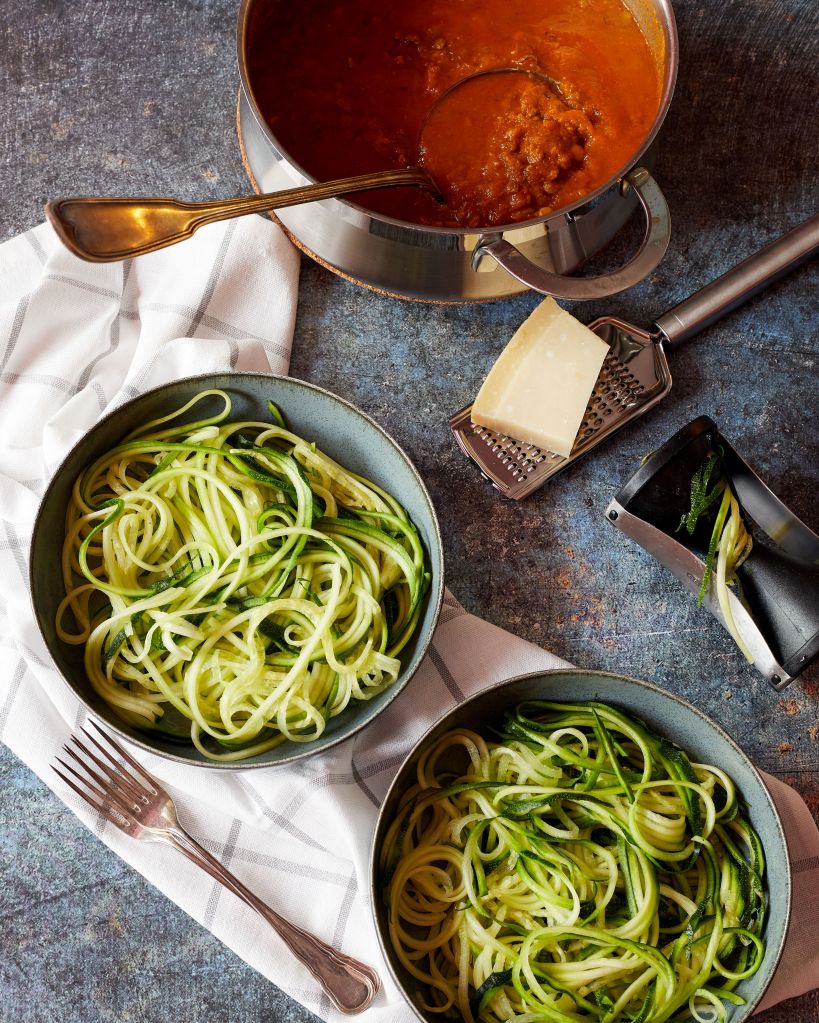 В тази рецепта спагетите са заменени със спирализирани тиквички. Ако нямате спирализатор, можете да си направите „папарделе“ като нарежете на тънки ленти с картофобелачка или мандолина.