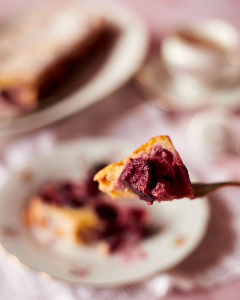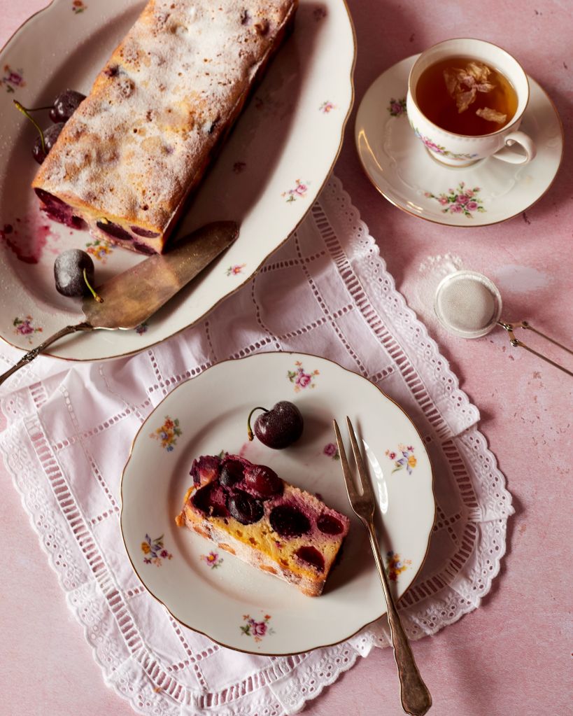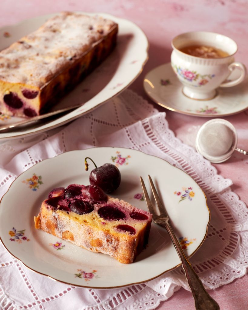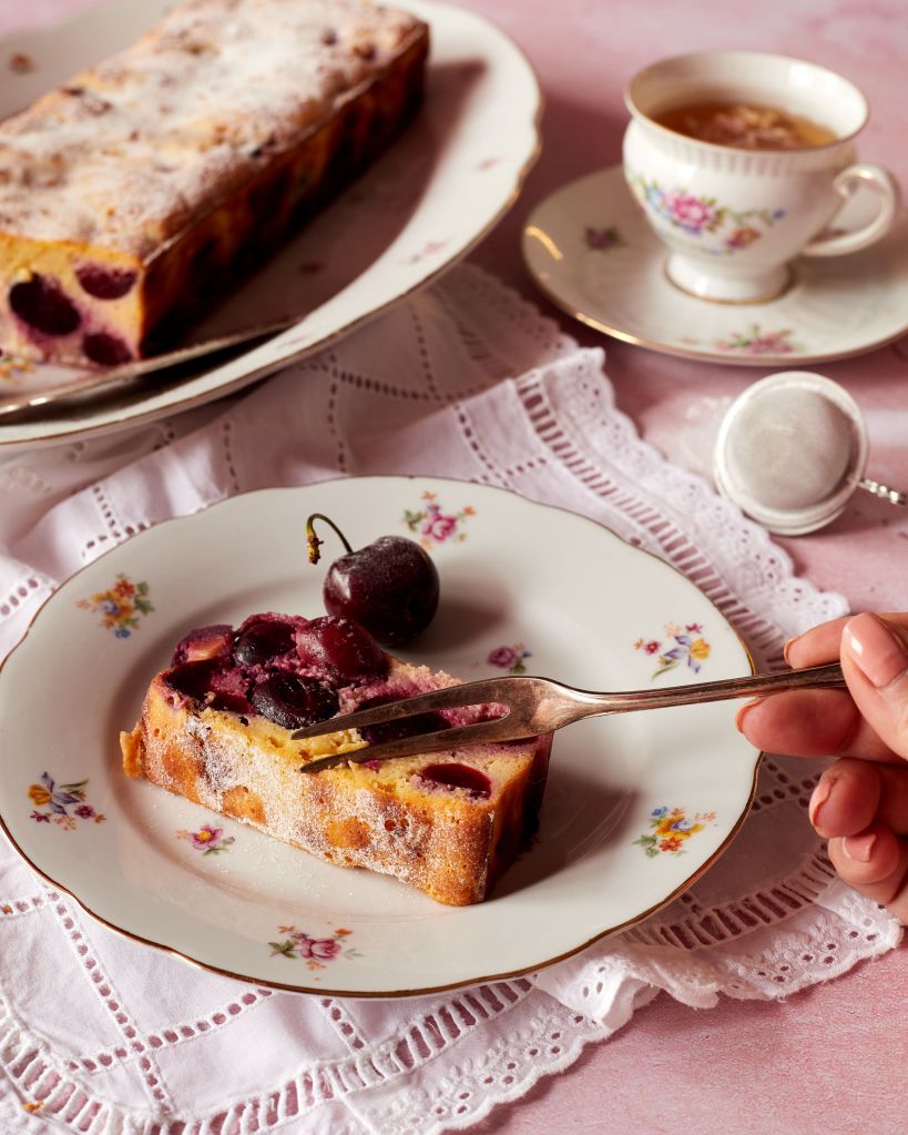 В сезона на черешите е време за експерименти с тях. Като този кекс (макар че кекс не е съвсем точно определение) с извара, зехтин и брашно от нахут. Вкусът е богат и наситен. Понеже има много малко брашно и относително много яйца, текстурата е нещо средно между сладкиш и крем карамел. Напомня клафути, но е различен.