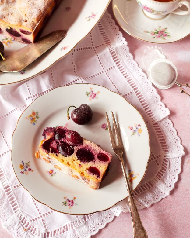В сезона на черешите е време за експерименти с тях. Като този кекс (макар че кекс не е съвсем точно определение) с извара, зехтин и брашно от нахут. Вкусът е богат и наситен. Понеже има много малко брашно и относително много яйца, текстурата е нещо средно между сладкиш и крем карамел. Напомня клафути, но е различен.