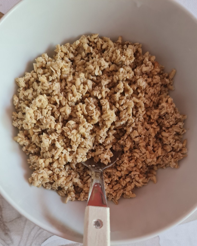 Сварете накиснатата за около 8 часа и отцедена леща – около 3 – 5 минути. Отцедете много добре и оставете леко да се охлади. Отцедете добре накиснатия овес и го минете в блендер, така че зърната да се натрошат, но да не бъдат смлени (вижте снимката).