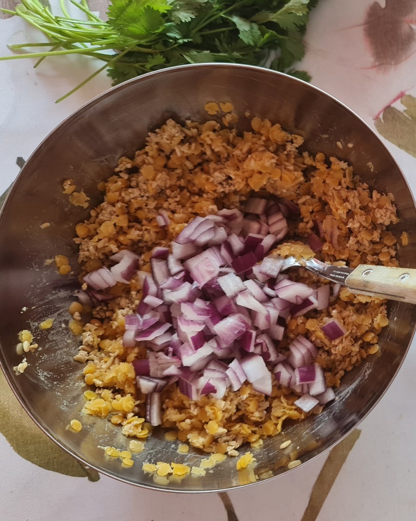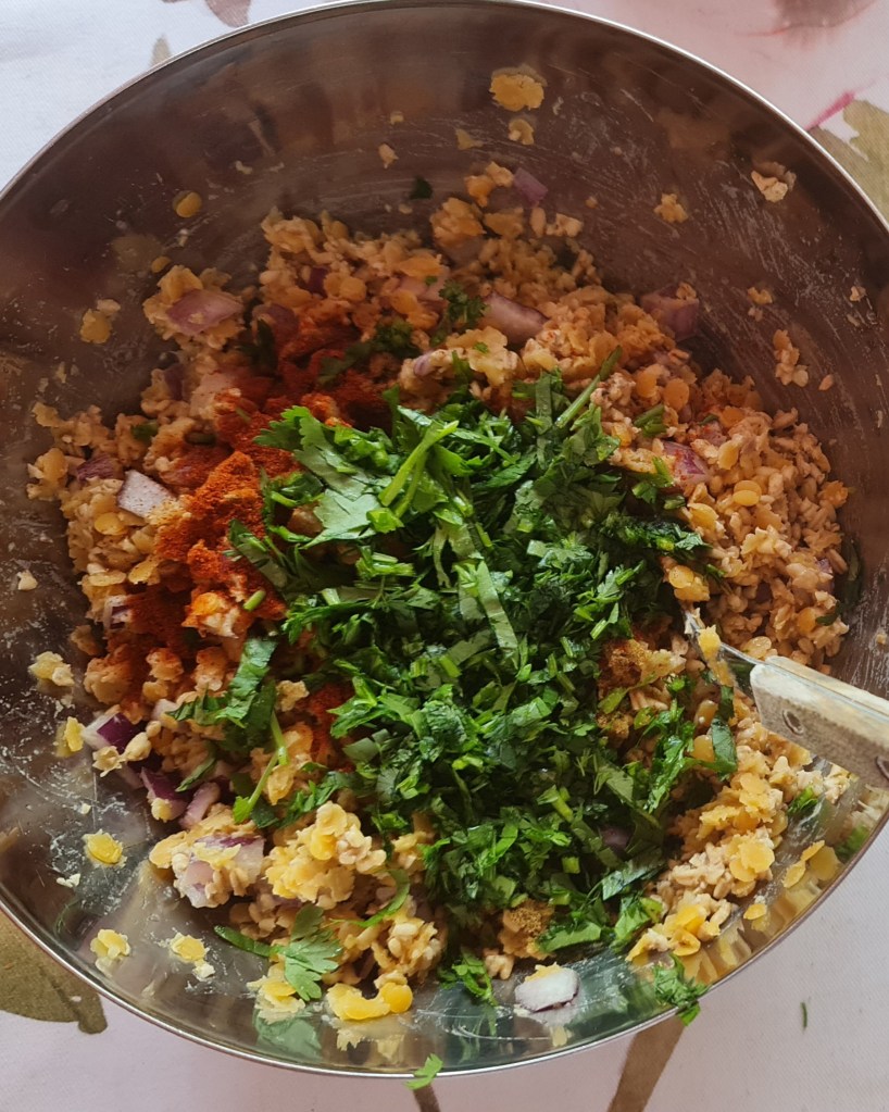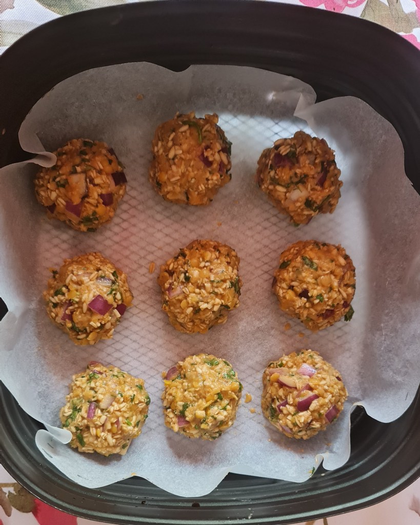 Веднага си харесах едни кюфтенца от червена леща и преди два дни направих тази версия с овес вместо булгур (заради глутена) и в air fryer. Направих няколко промени, свързани с избрания начин на приготвяне.