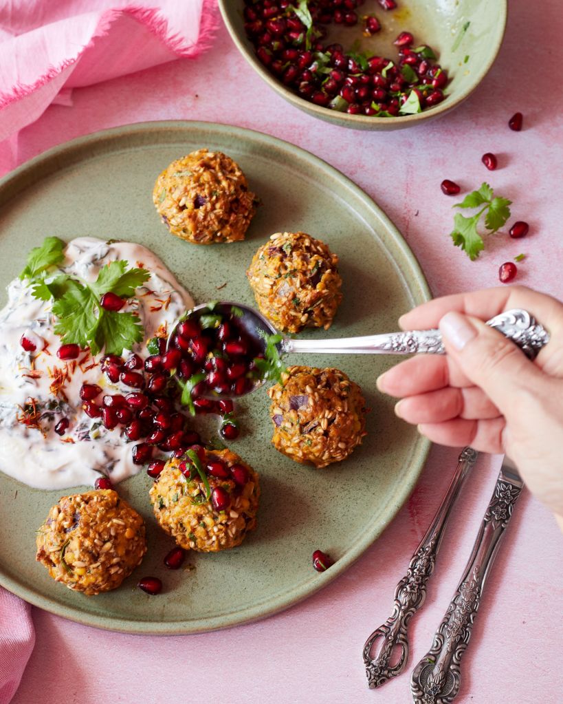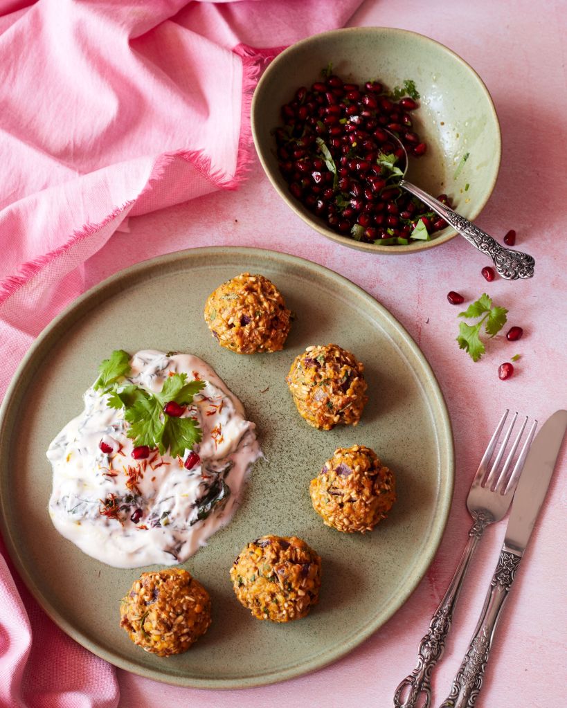 Освен салатата от нар и кориандър от книгата, реших да добавя и задушен манголд с цедено козе кисело мляко и шафран. Tака предястието се превръща в основно ястие. Комбинацията от трите е много сполучлива и е истинска наслада за очите и небцето. Еднакво вкусно е докато кюфтенцата са топли и след като изстинат.