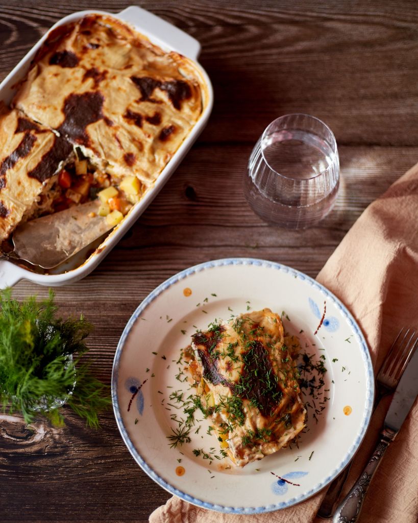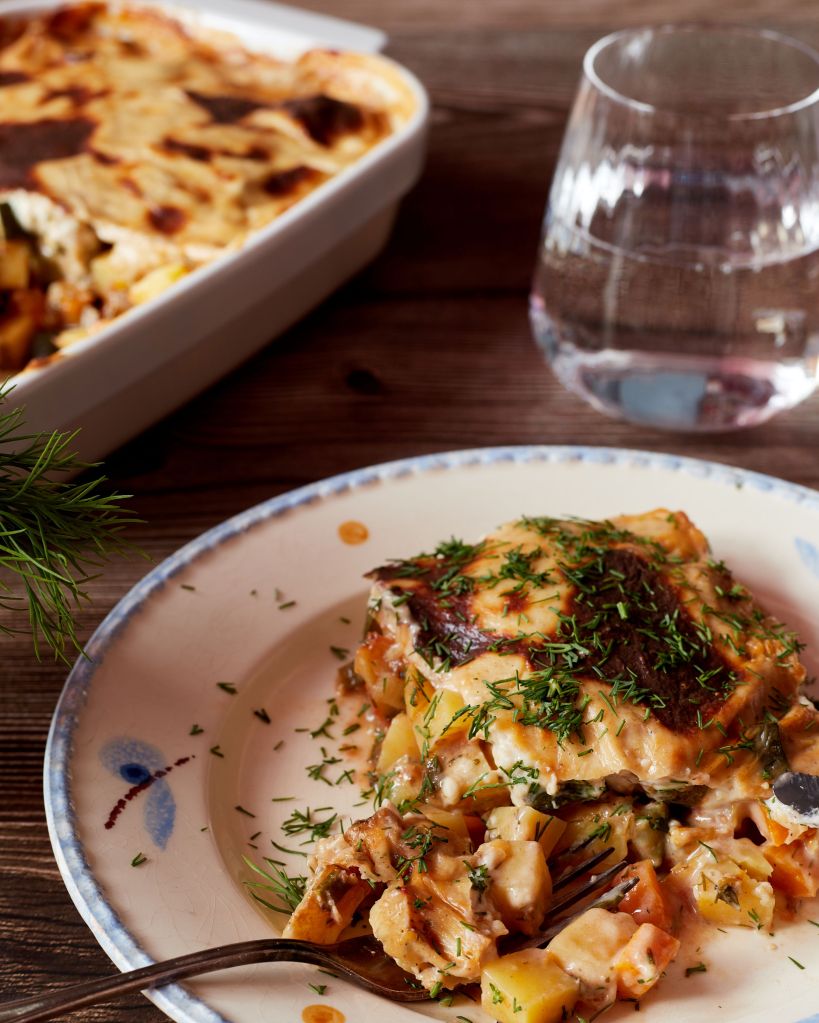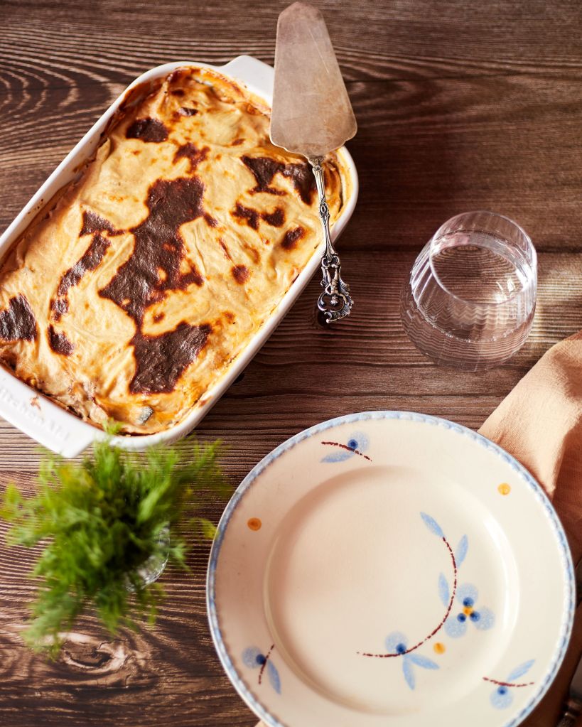 Реших да я направя със сос бешамел, който лесно се веганизира със зехтин и растително мляко, вместо стандартните масло и краве мляко. Пробвала съм. Не е съвсем същото, но определено става за алтернатива.
