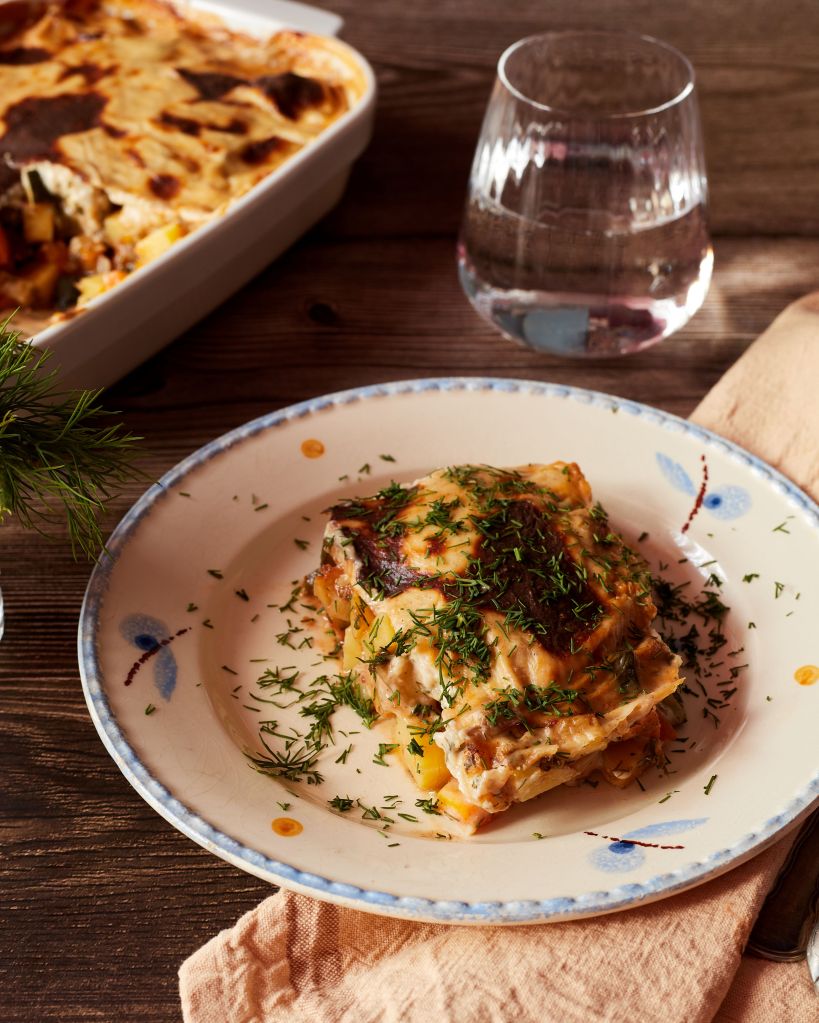 Нарязах зеленчуците на еднакви по големина кубчета и ги добавих постепенно, според времето им за готвене – общо взето това е единствения тънък момент. Предната вечер приготвих плънката и я прехвърлих в тавата. На следващия ден запекох леко, докато приготвях сос бешамел и след това залях и върнах във фурната.