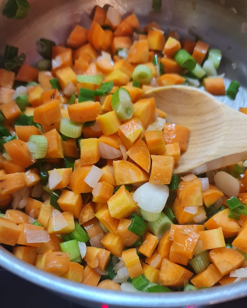 Както споменах, единственият тънък момент тук е последователността на добавяне на зеленчуците. Лукът естествено е пръв.