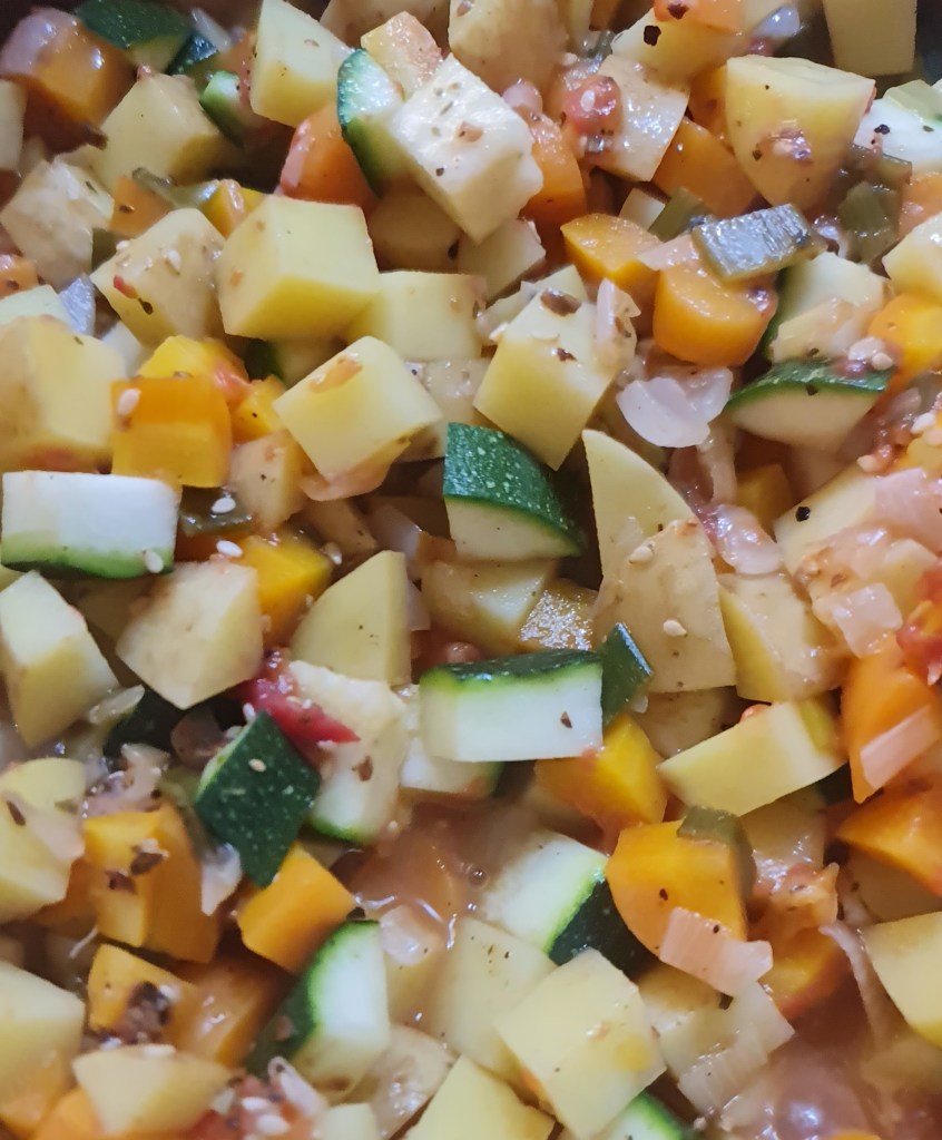 Вдъхновение дебне отвсякъде :). Преди няколко дни видях в Инстаграм пост за мусака с тиквички и това ми даде идея за наличните зеленчуци. Имах тиквичка, пресни картофи и моркови. Списъкът може да бъде продължен с патладжан и дори гъби, ако ви се намират. Количеството трябва да се съобрази единствено с размера на тавата, която ще ползвате.