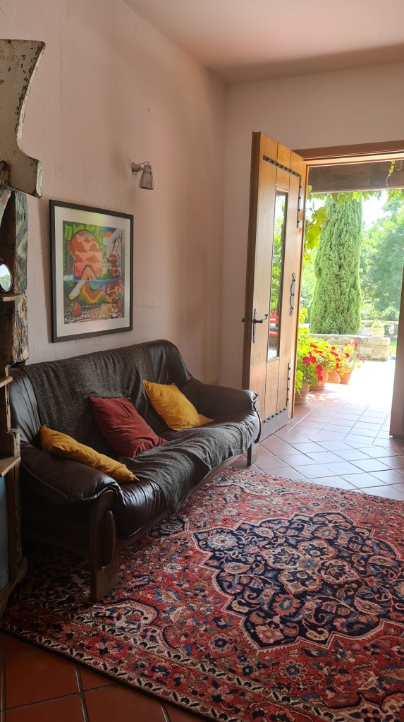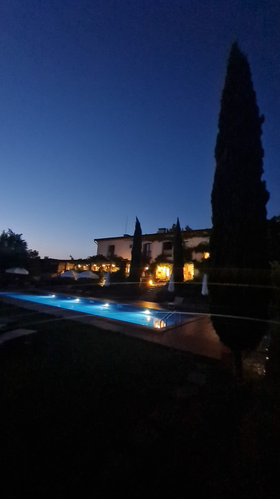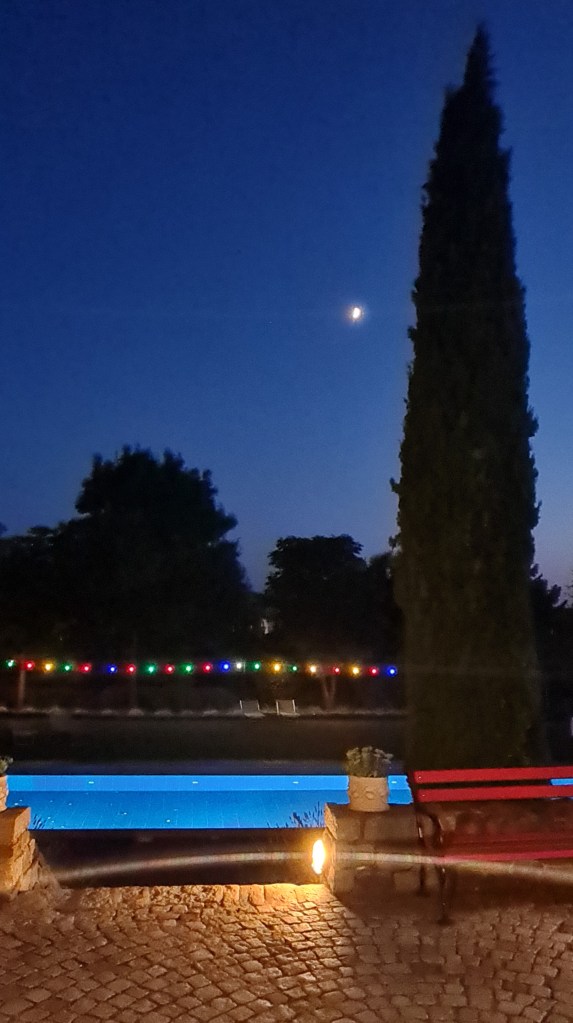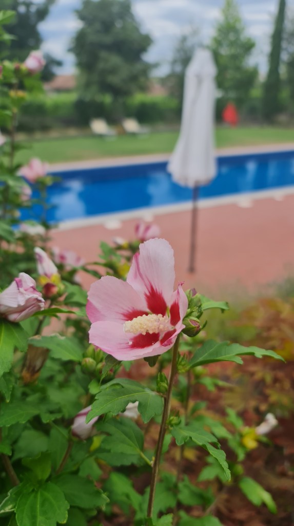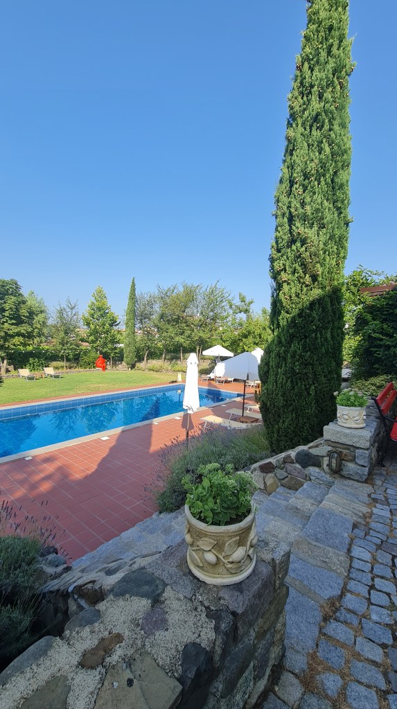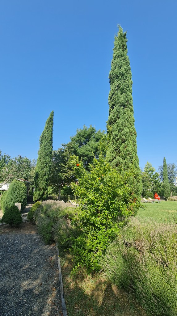Предният двор с басейна е много приятно място, ухаещо на лавандула. Няколкото високи кипариса създават усещането, че сте в Тоскана. Следобед сенките и басейнът са идеално спасение от жегата.