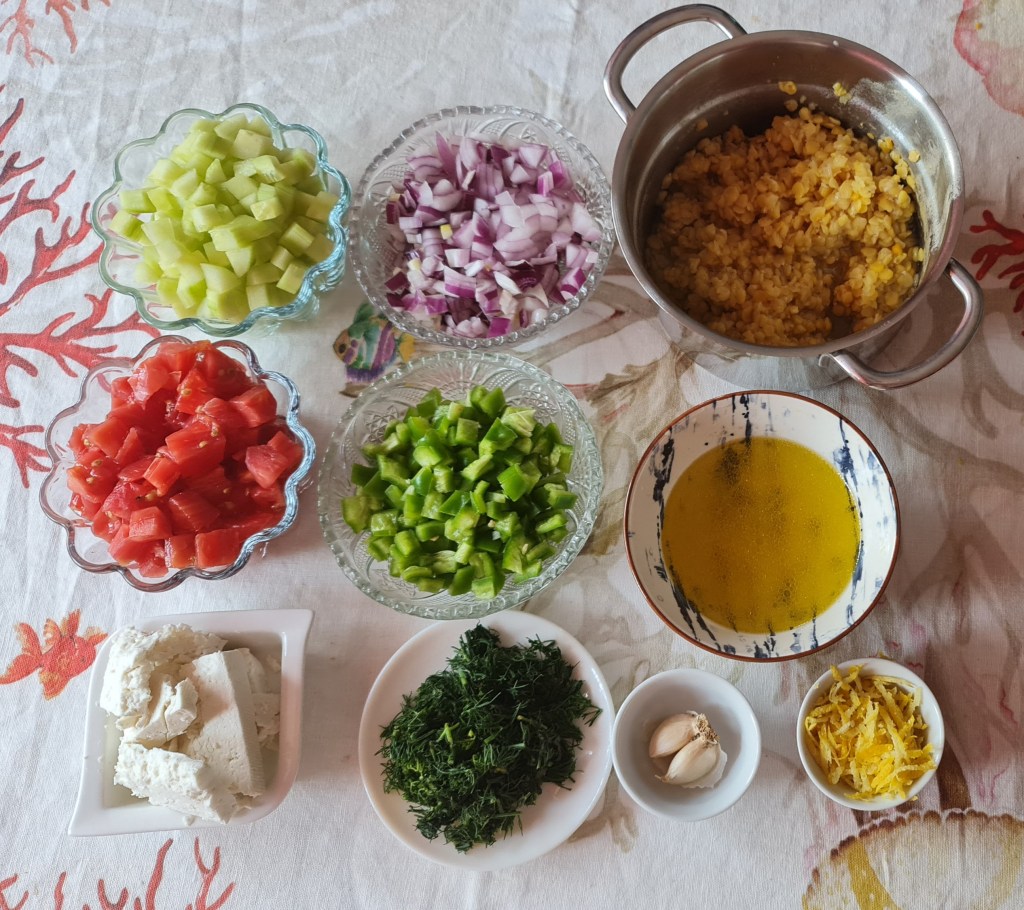 С тези продукти вариантите са много, но се спрях на салата. Август е и, въпреки че се надявам 40-градусовите жеги да са зад гърба ни, все още е прекалено топло за готвене по обед. За тази салата реших да сваря малко гръцка фава, която не иска много готвене и, понеже не беше необходимо да е топла, я приготвих рано сутринта.
