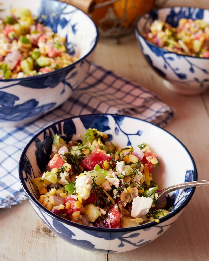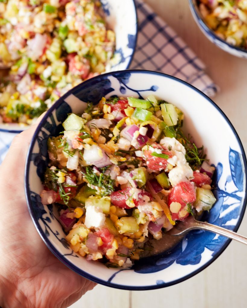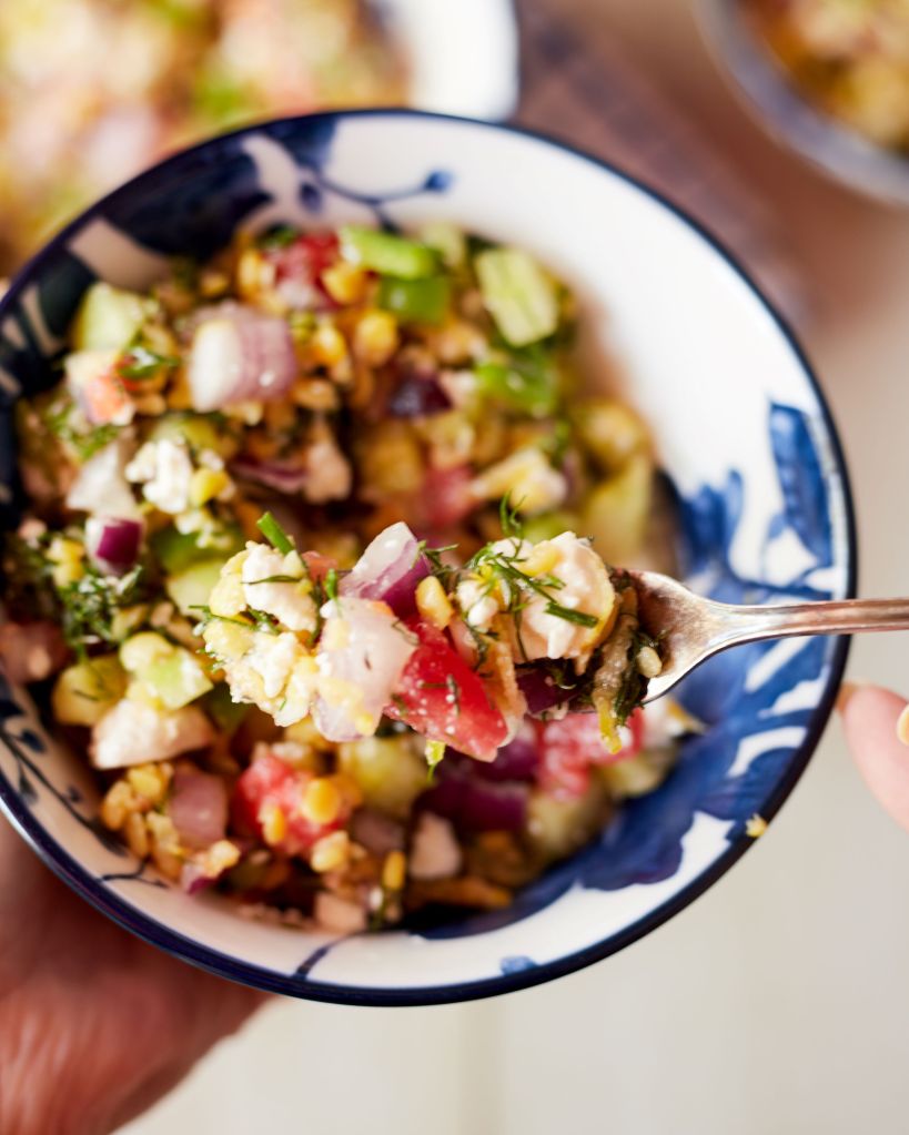 Добавих краставица, пресни чушки, чесън, настъргана лимонова кора, натрошено козе сирене и салатен дресинг. Свежо, лятно и много вкусно. Ако нямате или не харесвате фава, може да замените с киноа, нахут, друго бобово или зърнено като овес, булгур или елда.