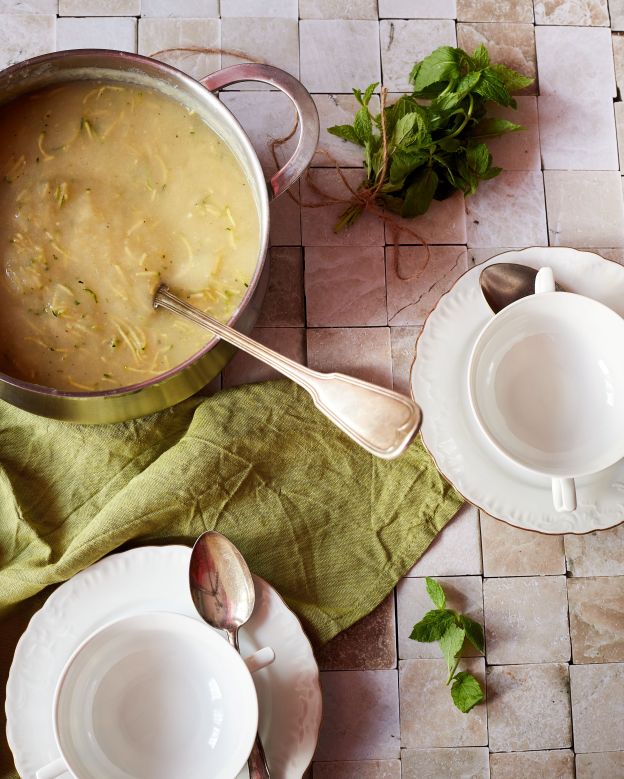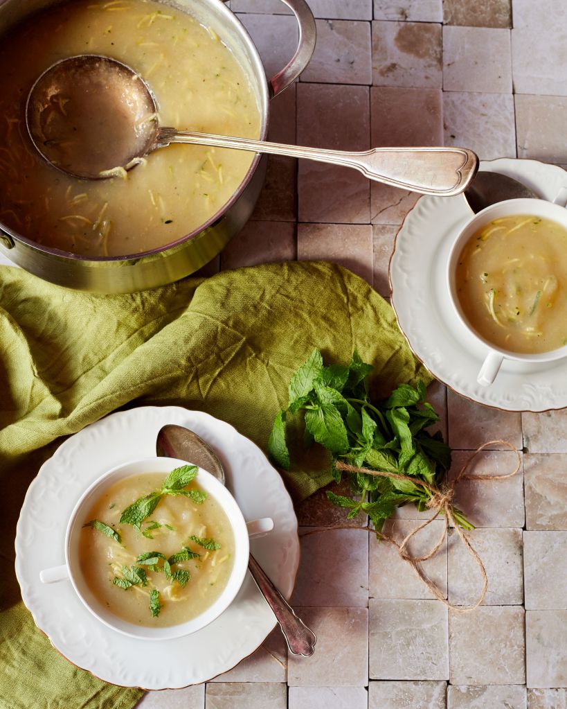 Пасирайте и, ако е необходимо, добавете вода до желаната консистенция – моята е почти като на пюре. Подправете със сол и черен пипер, добавете тиквичките и зехтина и върнете на котлона за 2 – 3 минути. Сервирайте с пресен джоджен.