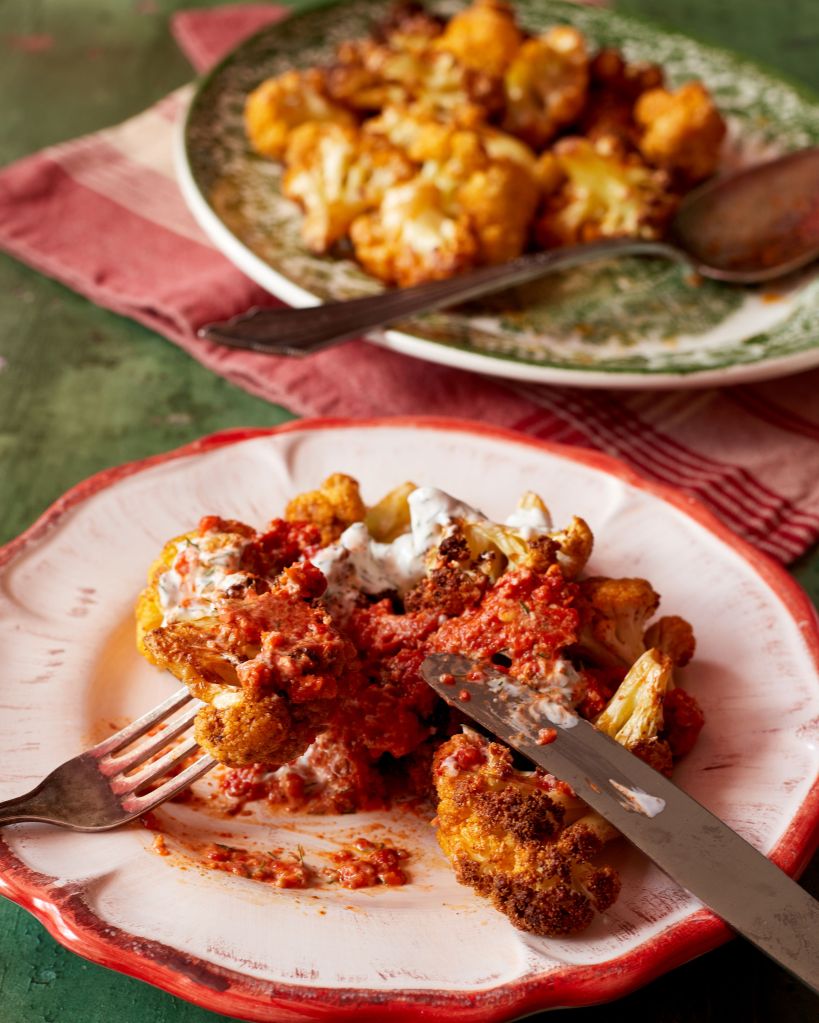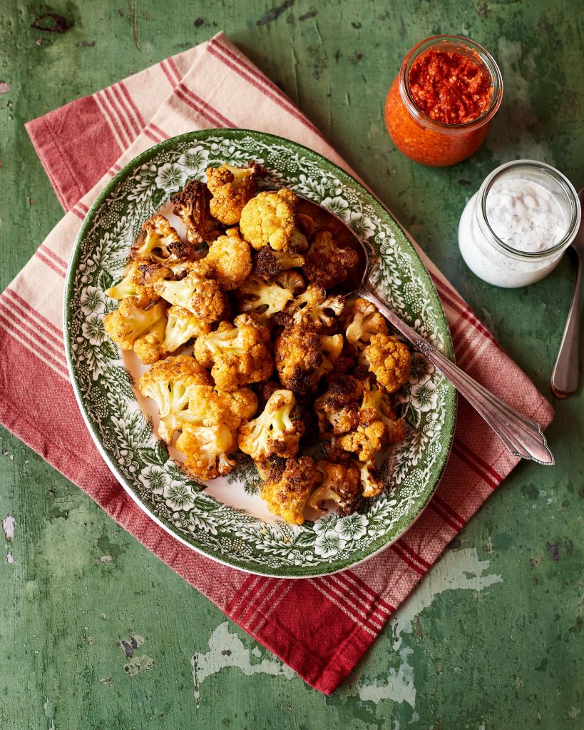 Спокойно може да се сервира и така, гарниран със струйка хубав зехтин, но някой беше казал (мисля, че беше мадам дьо Помпадур), че сосът прави ястието. Затова сега ви предлагам не един, а два соса. Също толкова бързи и лесни, които прекрасно си хармонират с карфиола. Сос ромеско от печени червени чушки и орехи и сос от цедено кисело мляко с копър. Пробвайте и, ако сте имали някакви колебания за карфиола, ще се влюбите.